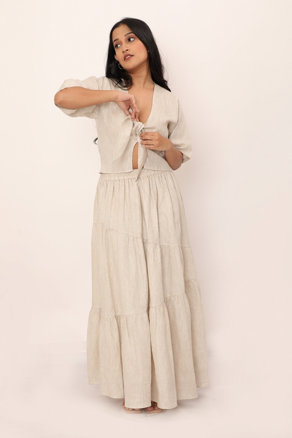 Embrace the effortless charm of the Shania set, designed to move with you. With a flattering tie-front top and a flowy, tiered skirt, this ensemble brings together relaxed elegance and refined comfort. Whether you’re enjoying a casual day out or attending a special event, Shania is your go-to for any occasion. Crafted with meticulous attention to detail, this set ensures timeless wearability and versatility, making it a perfect addition to your wardrobe.