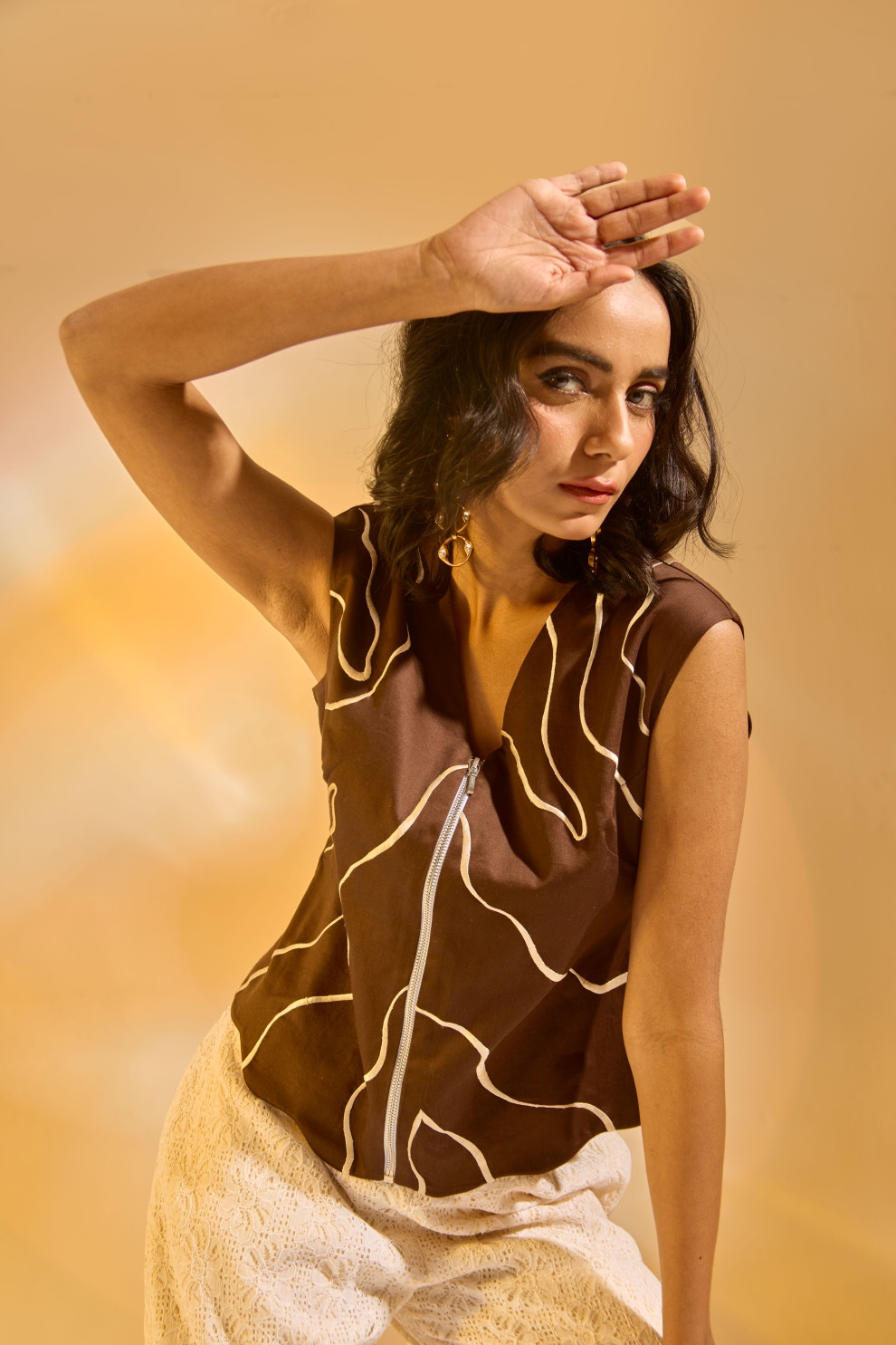 This textured top features a wavy hem and a front zipper, paired with lace fabric bell-shaped pants that bring a sense of sophistication and movement. A beautiful fusion of modern structure and delicate texture.