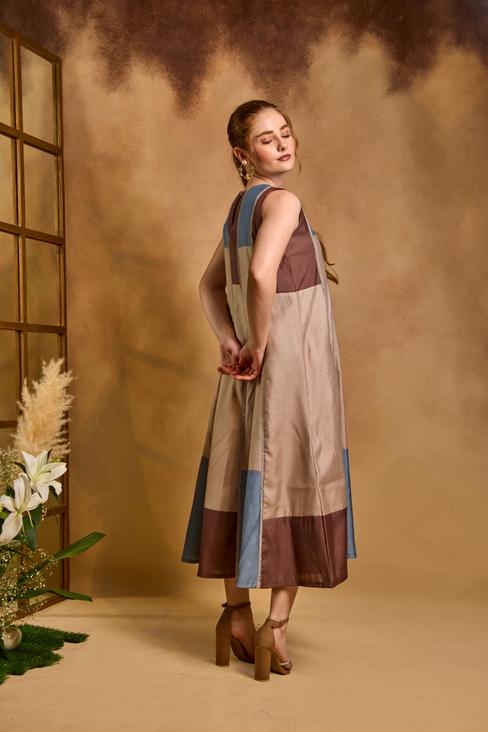An A-line dress featuring panel-cut lace inserts and color-blocked panels arranged in a piano effect, combining structured elegance with delicate textural detailing for a refined, contemporary silhouette.