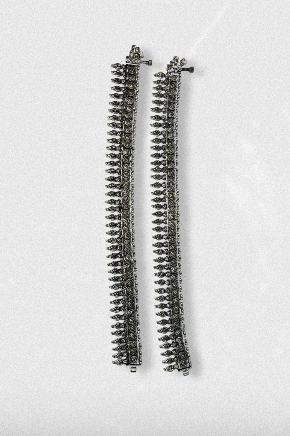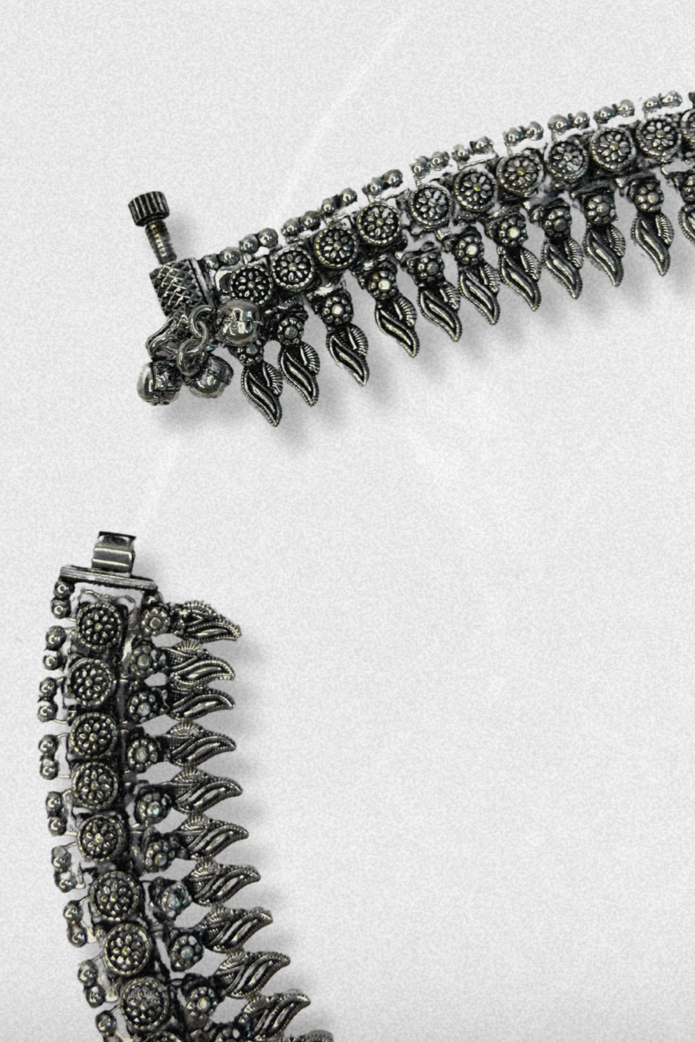 Fierce and feminine, the Teerwa Silver Blade Anklets are edged with sharp leaf-like motifs, radiating bold energy and precision. Their fine detailing and robust design make them a standout accessory for any powerful ensemble. Style tip: Wear them with cotton sarees or flowy lehengas to add structured elegance to your look. Perfect for haldi or mehndi functions. Size : Length 25 cm all round Weight : 127 gram Material : Brass