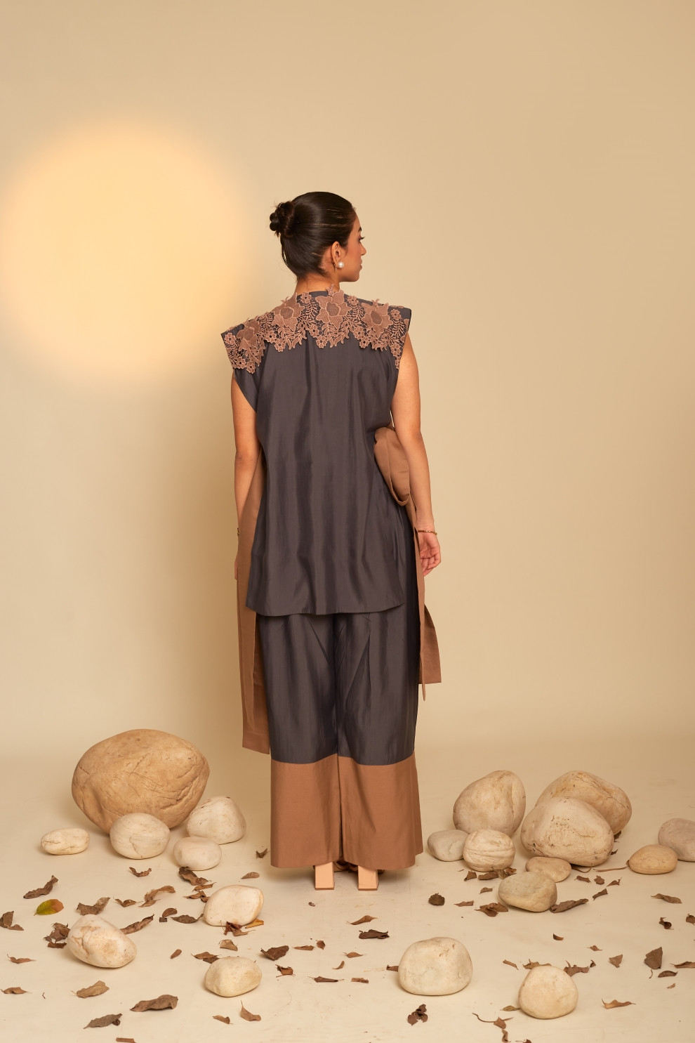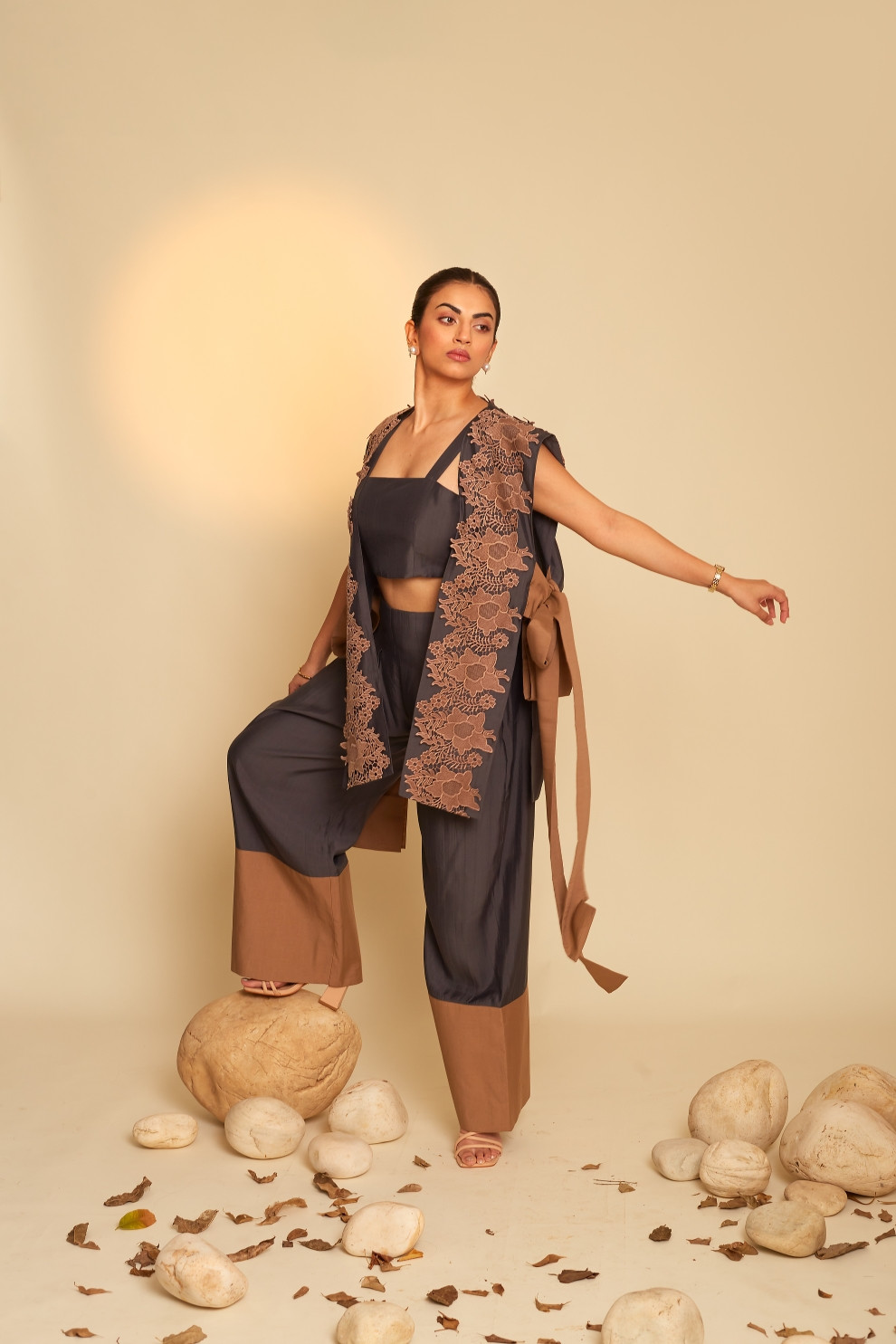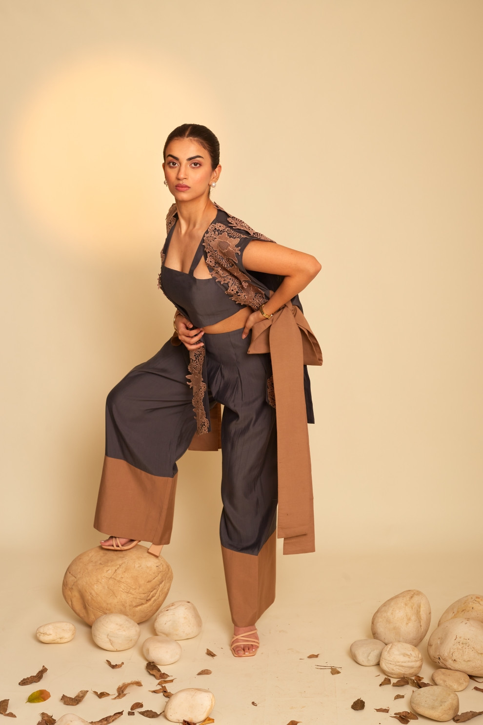 This chic three-piece ensemble features a sleek bustier, striking color-blocked pants, and a relaxed shrug. The shrug is adorned with delicate lace and statement side tie-up knots, seamlessly blending modern flair with timeless elegance.