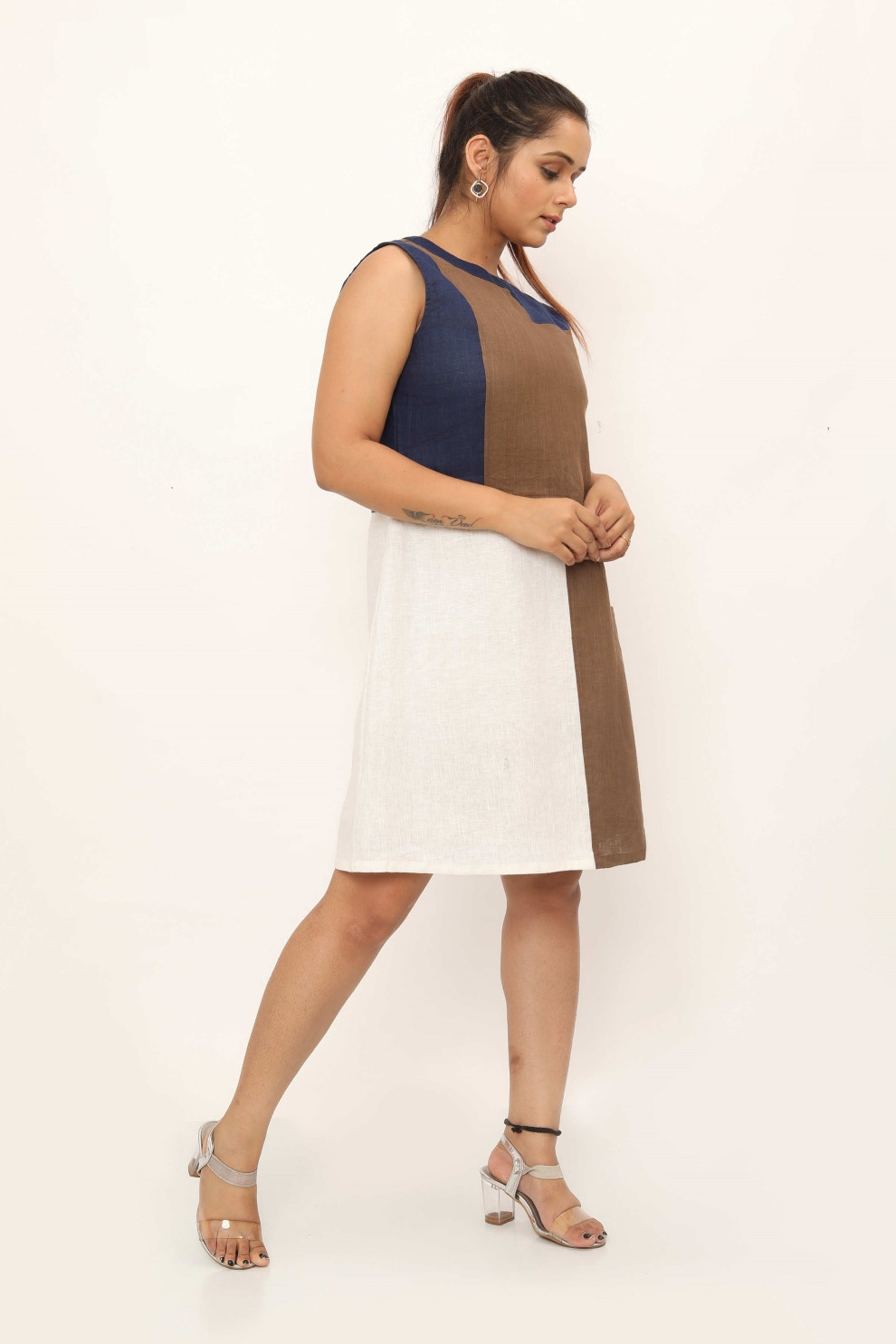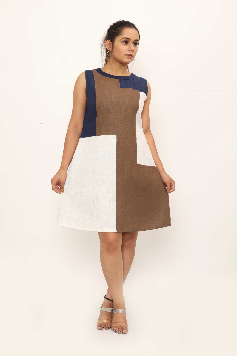 Introducing the Topanga Dress – a vision of casual elegance crafted from luxurious linen. This shift dress features eye-catching colour-blocked rectangle joints, adding depth and texture to its design. Elevate your style with this versatile piece, offering both comfort and chic sophistication for any occasion. Layer it with a denim jacket and sneakers for a chic street-style look, or pair it with a tailored blazer and ankle boots for a sophisticated urban look.