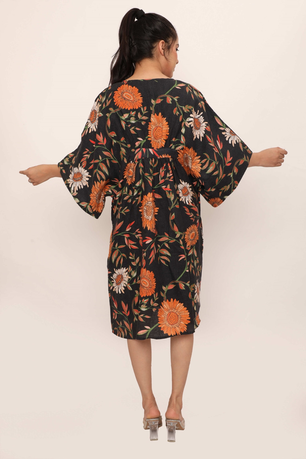 A vibrant and effortlessly stylish piece perfect for any occasion. This dress features a striking print that adds a touch of boldness and femininity. The relaxed fit, along with wide kimono sleeves, ensures comfort and ease of movement. The dress also includes a subtle V-neckline and a gathered waist detail at the back for a flattering silhouette. Whether you’re attending a garden party, a casual brunch, or simply enjoying a day out, this dress will keep you looking chic and feeling comfortable.