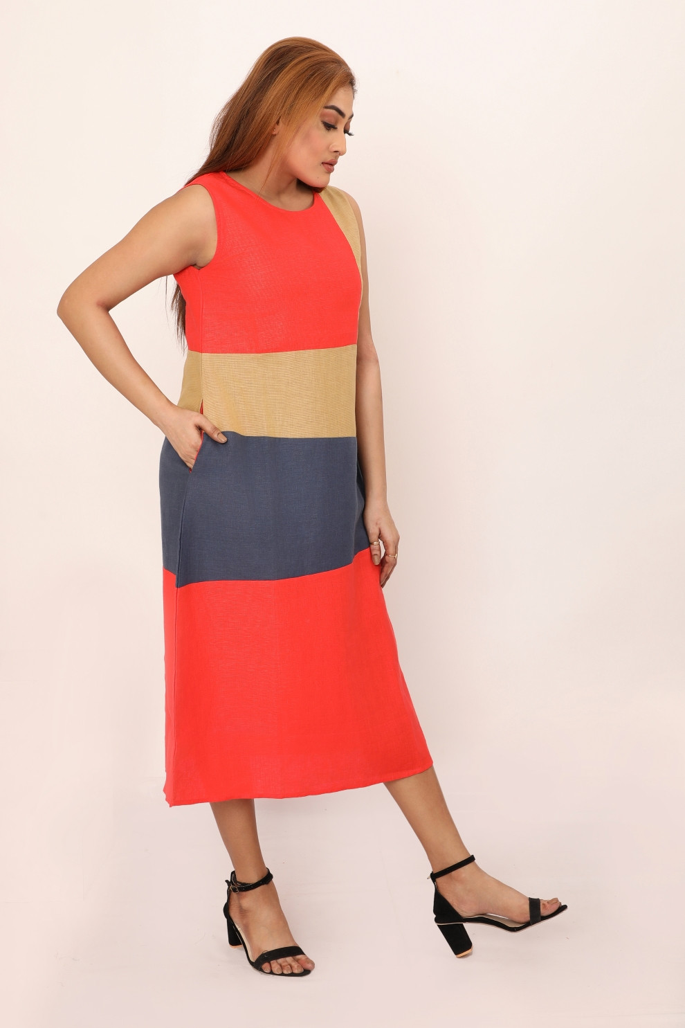 Embrace effortless elegance with the Vesper sleeveless midi dress. The relaxed silhouette and clean lines make it a versatile staple, perfect for both casual outings and more refined occasions. Thoughtfully designed with bold, geometric panels, this piece offers a playful yet polished look. Its breathable fabric ensures all-day comfort, while hidden side pockets add practicality without compromising on style. Pair it with your favourite accessories and step out in timeless ease.
