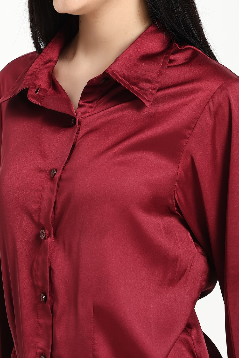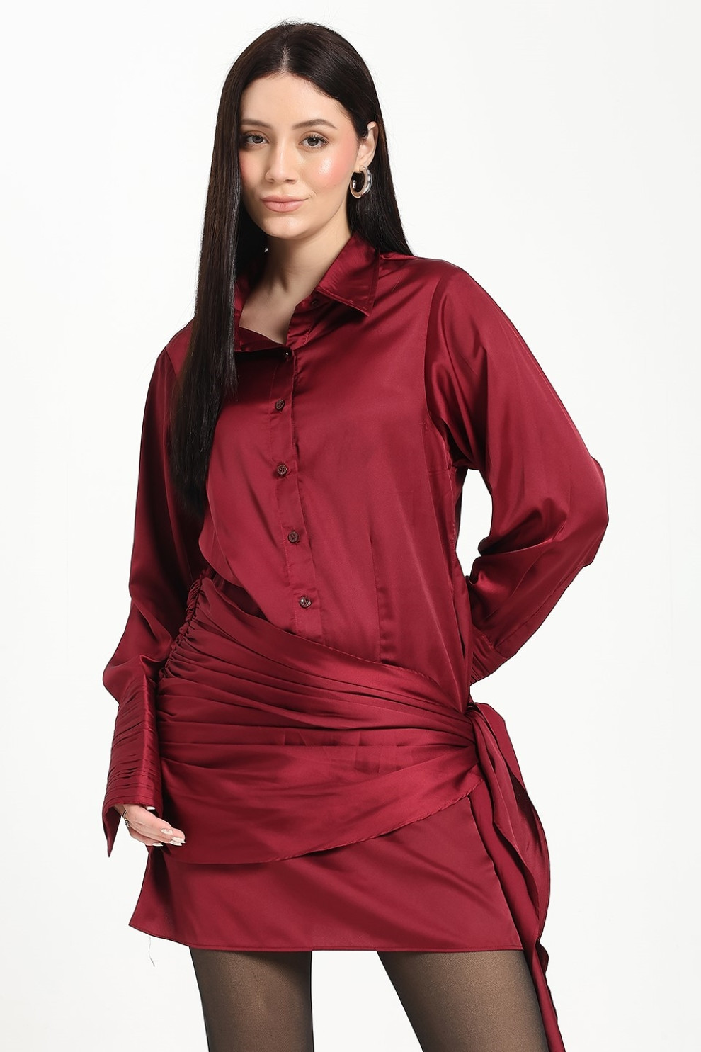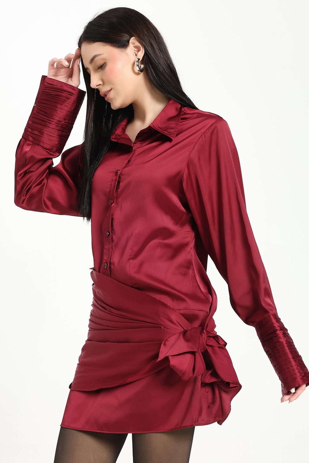 A blend of sophistication and playful allure, this shirt dress is designed to make every day feel effortlessly stylish. Featuring a flattering front closure and long sleeves, it’s both practical and polished. The attached scarf drape cinches and shapes the silhouette, adding movement and a touch of drama to your look.