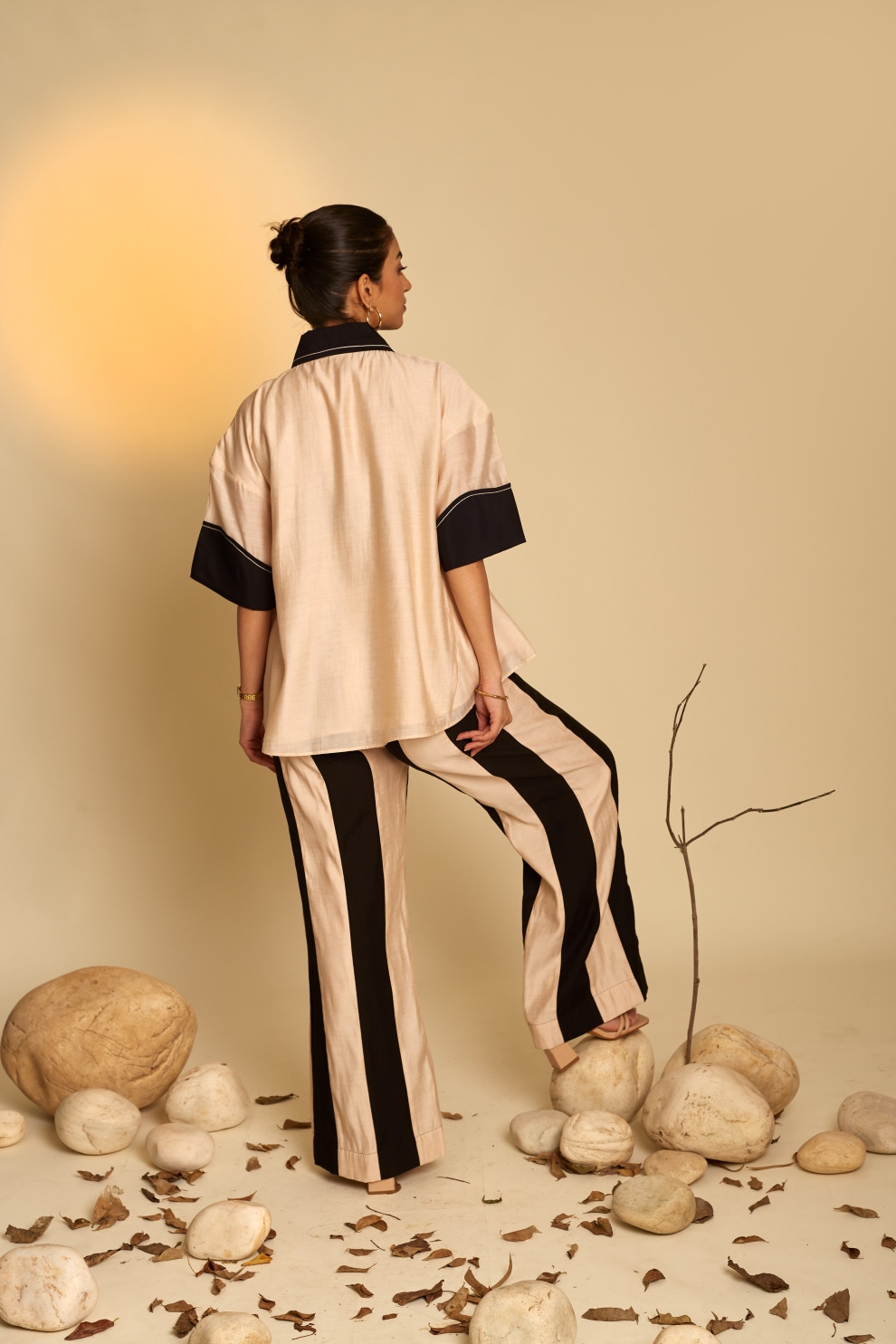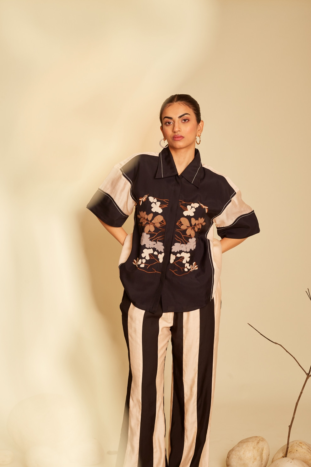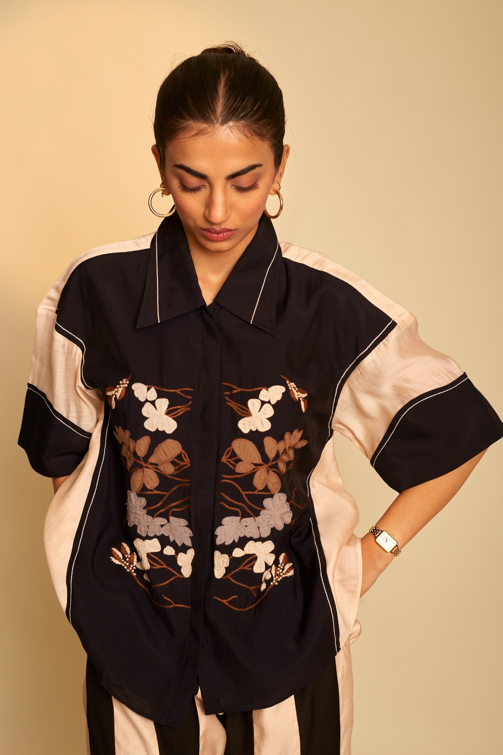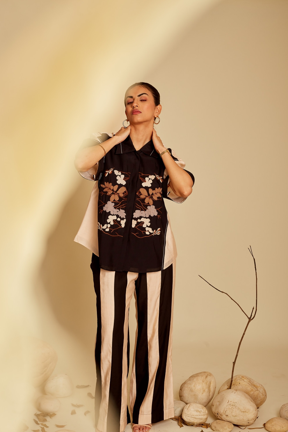 The Alyssa Set, expertly crafted from scrap materials, showcases a vibrant color block design enhanced with intricate floral front applique embroidery. Paired with sleek black and cream panel pants, it delivers a striking and sustainable fashion statement.