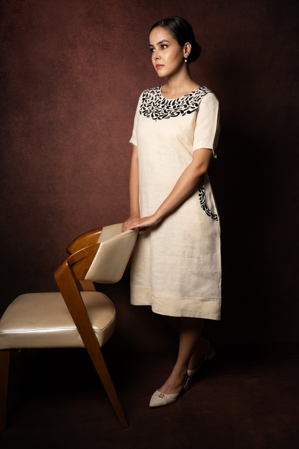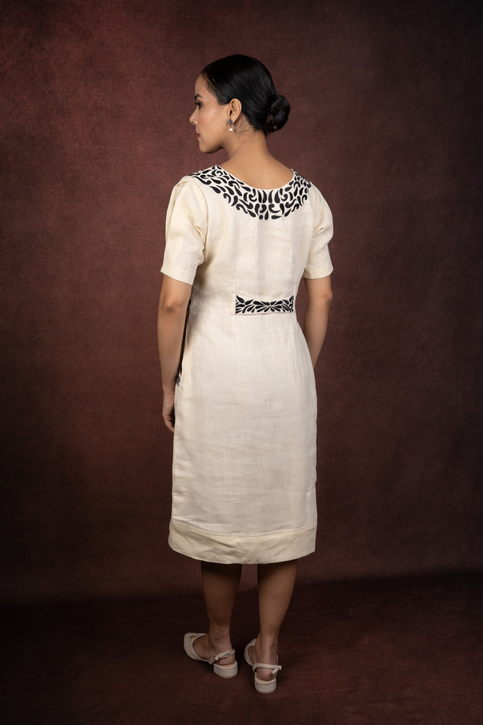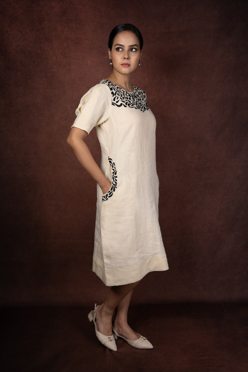HILIHIF Aruja Pure Handloom Linen Dress is a simplicity elevated with intention. The pure handloom linen celebrates artisanal charm, while providing a soft and lightweight feel. The embroidered motifs around the neck and pockets give definition and a pop of contrast color. Quietly elegant, this dress is designed to give you a relaxed yet put-together presence.