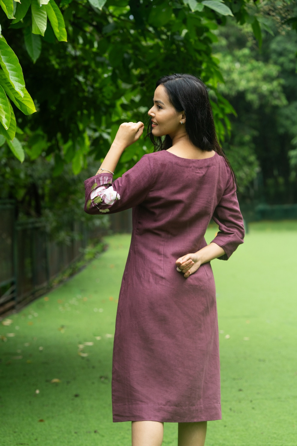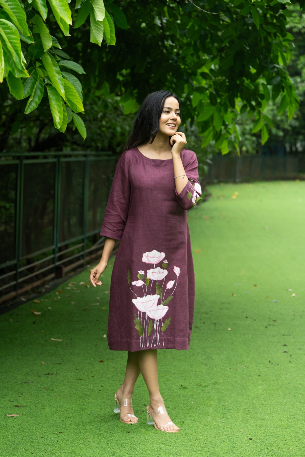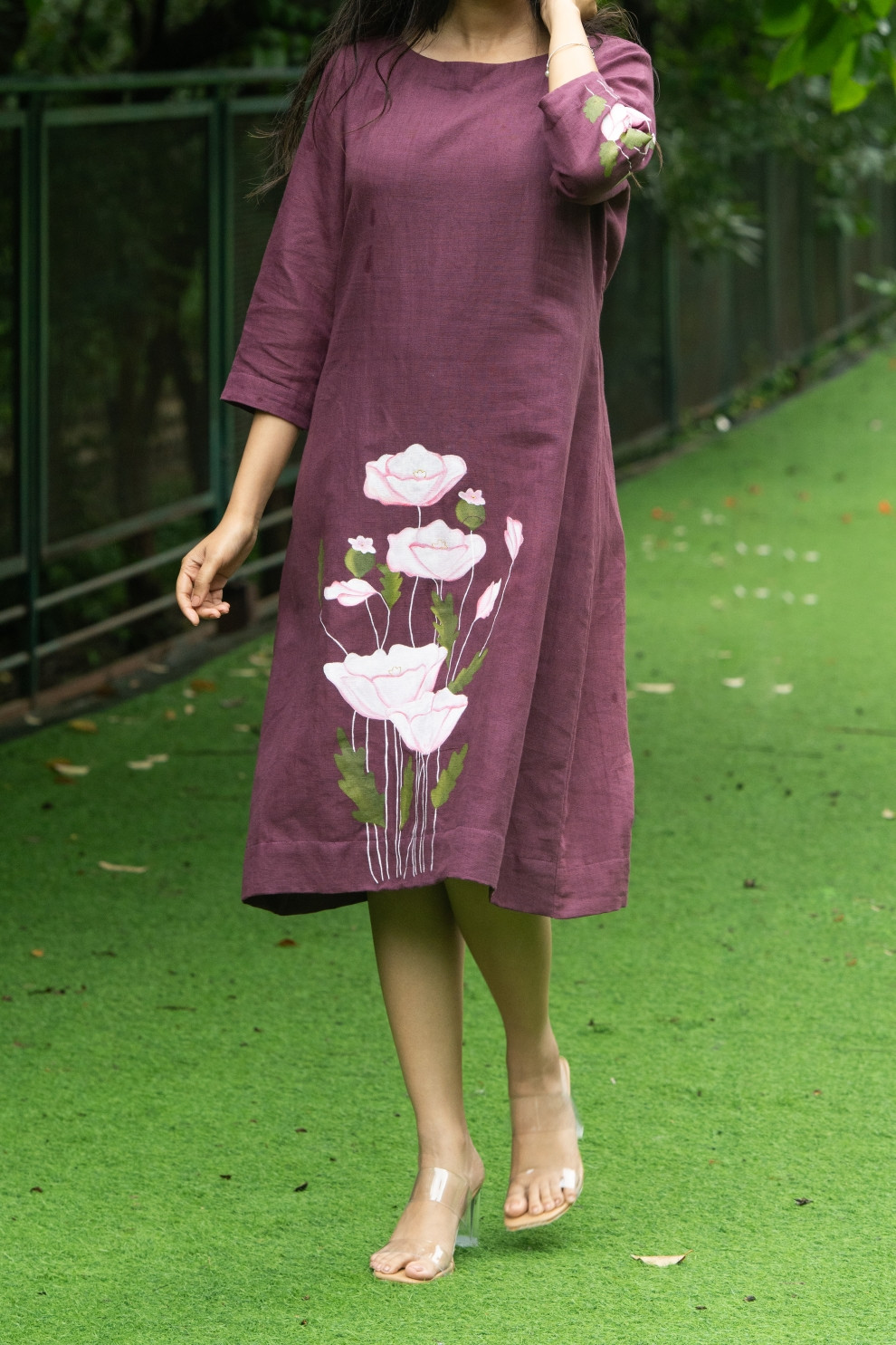 HILIHIF Bhumi Kala Cotton Hand-Painted A-Line Dress brings together texture, depth, and quiet artistry. The fabric natural character enhances its grounded elegance.,while the hand painted florals elevates aesthetic and artistic expression. The long sleeves makes it a graceful attire.