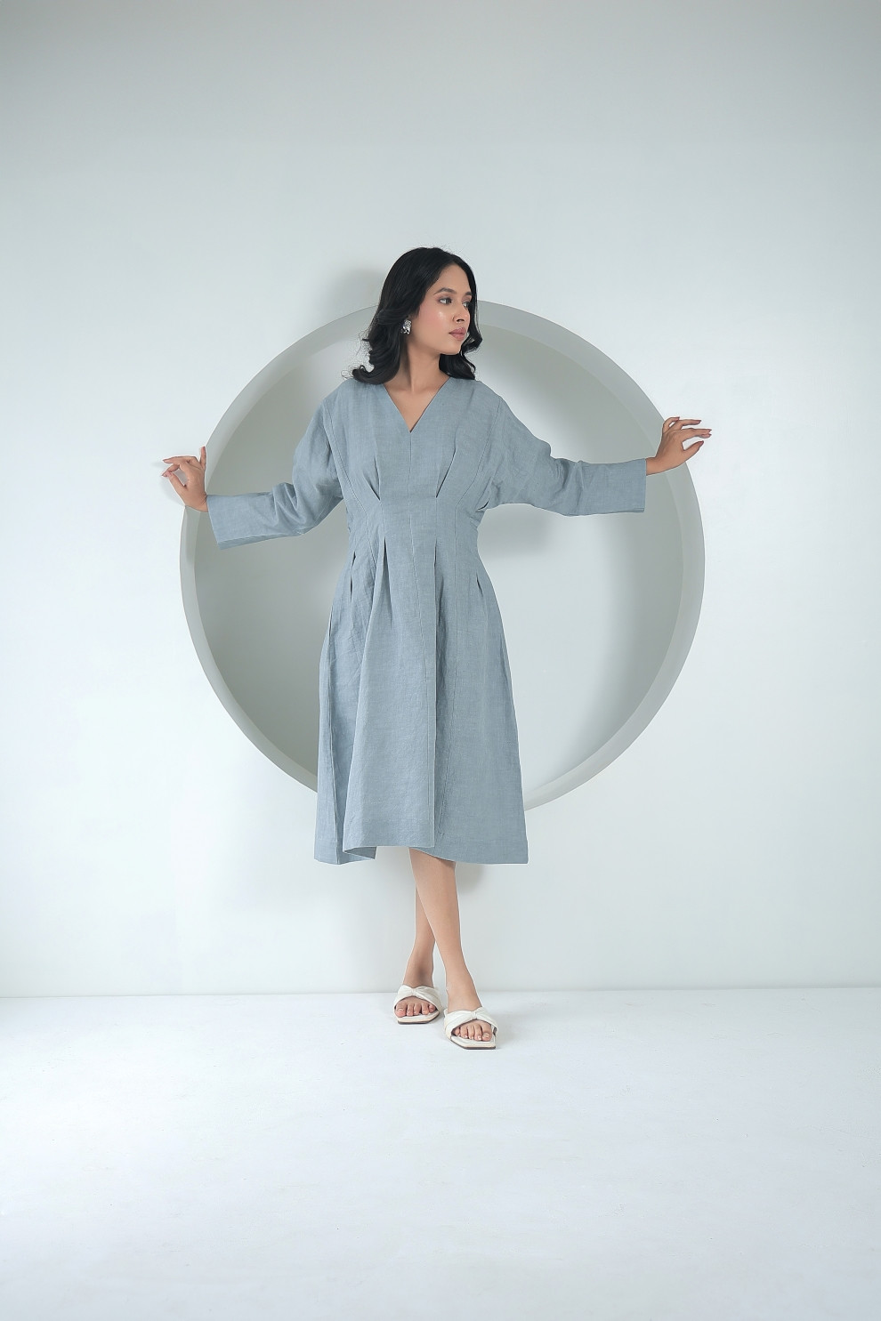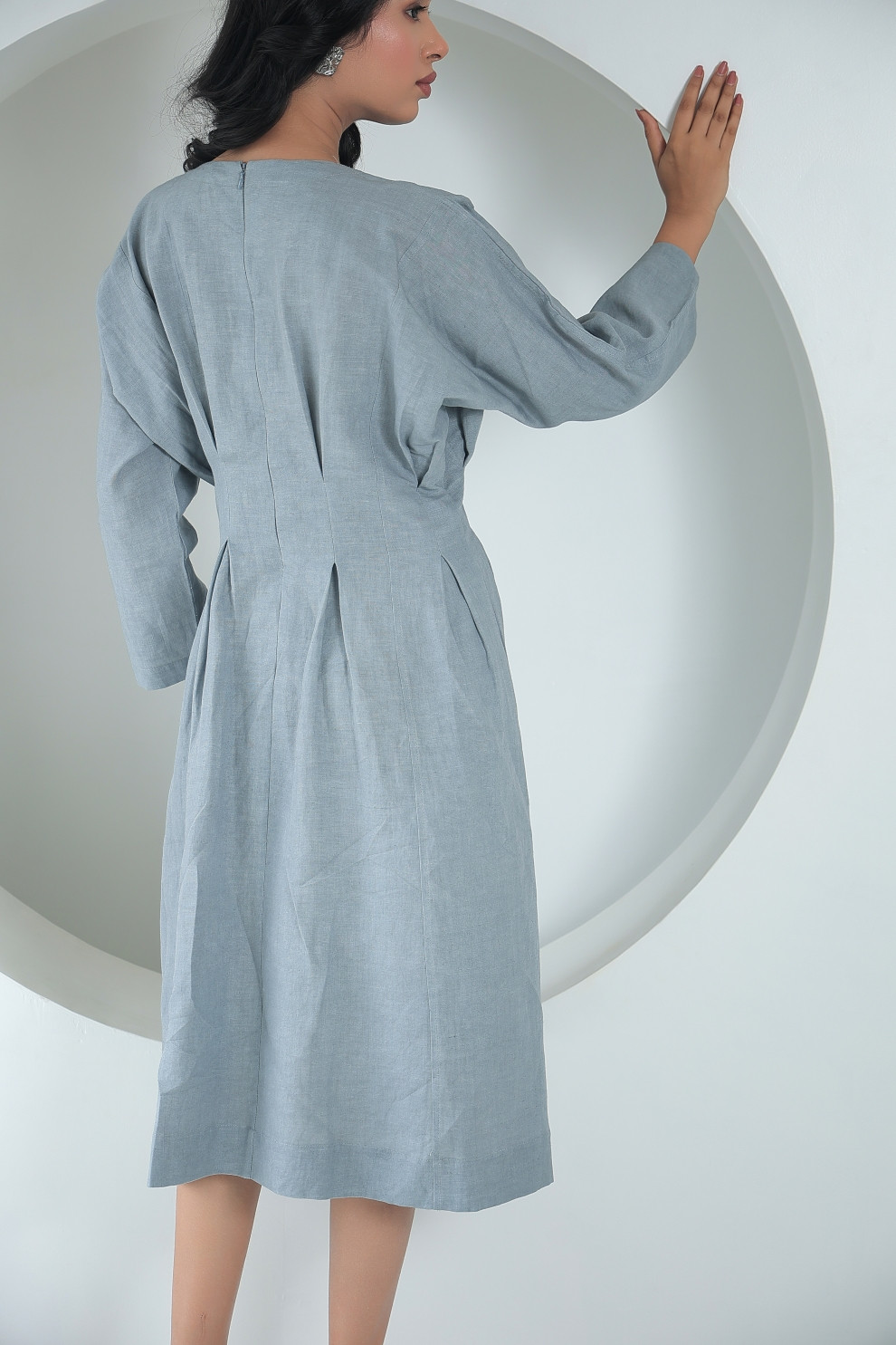 For the ease and style to go hand in hand choose the Tea & Dove grey midi dress. The put together cinched waist adds definition to the silhouette, while the pleated construct gives visual element to it. The neutral grey enhances its versatility, while the long sleeves gracefully adds the line to the design. Breathable linen texture vouches for comfort while the pleated style takes the centre stage.
