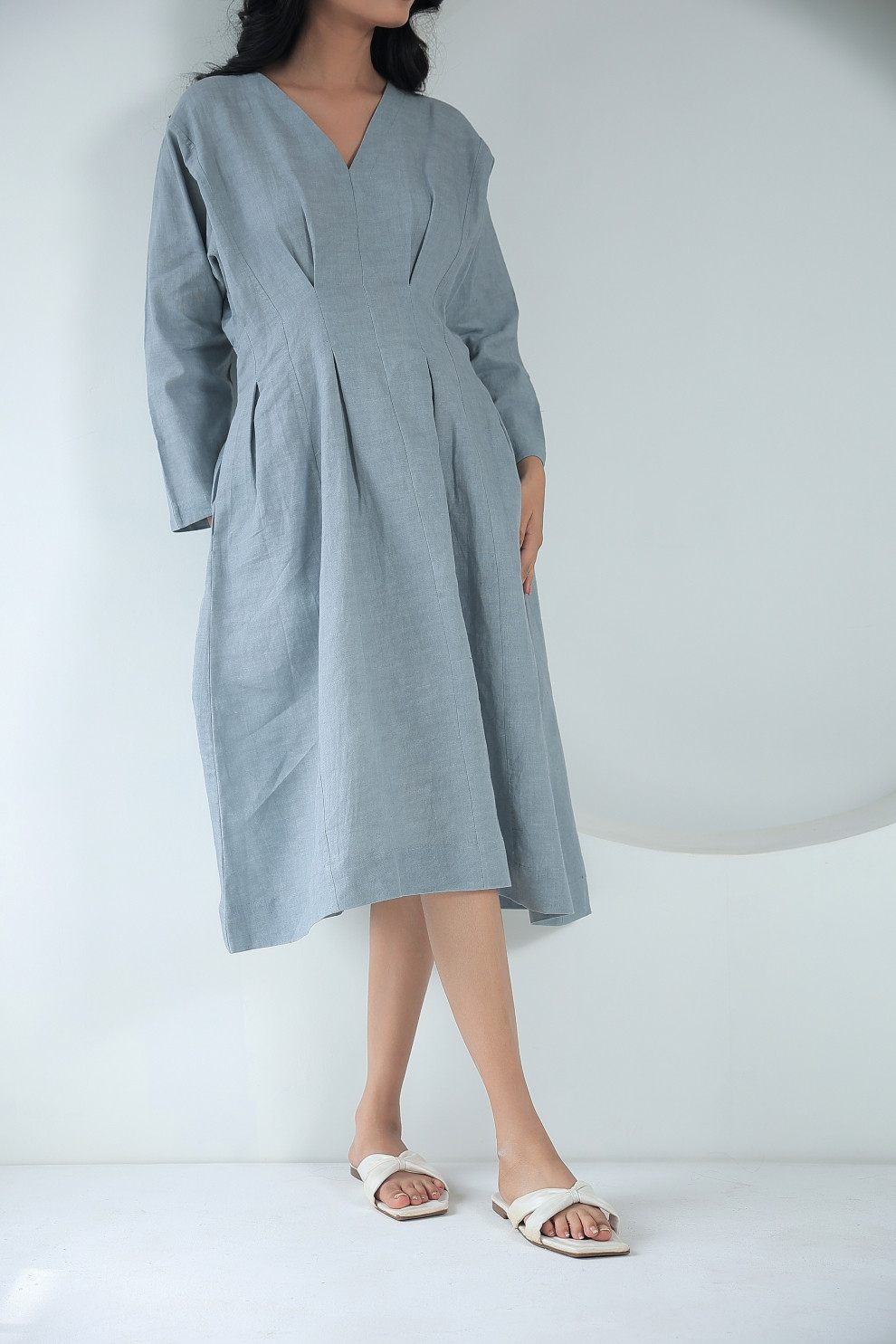 Tea & Dove Pleated Waist Linen Grey Midi Dress