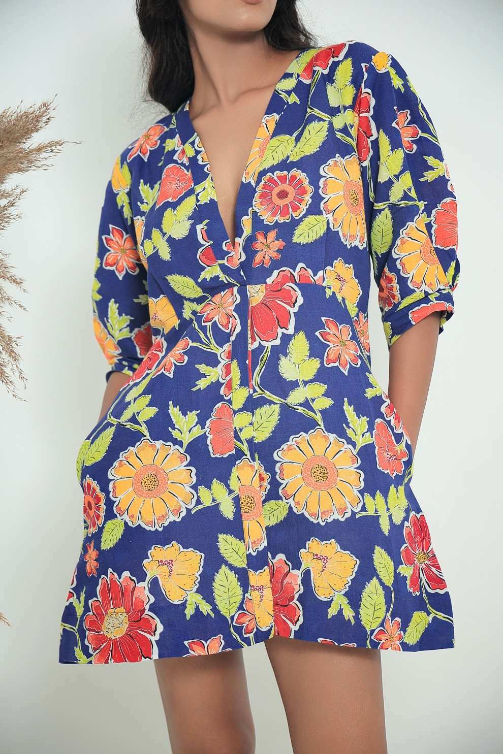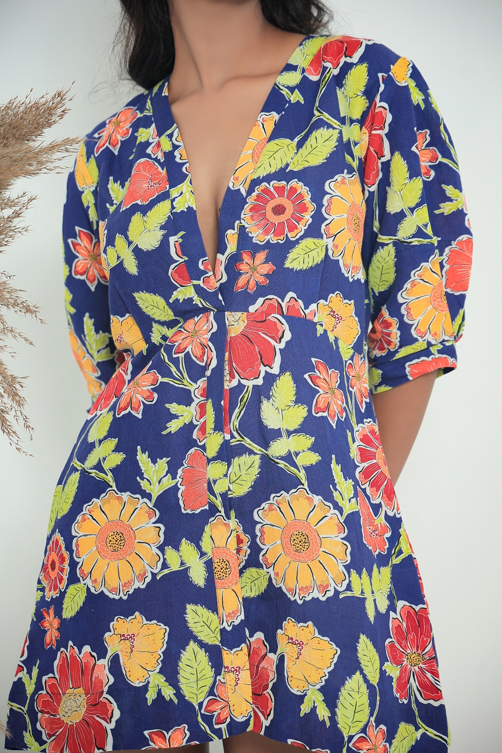 Cut from linen fabric, the piece celebrates natural texture and understated structure. The fabric is carefully selected for its comfort and lightweight feel, while the bold and contrast florals gives a visual rhythm to the silhouette. Fine stitching and clean finishes reflect craftsmanship.
