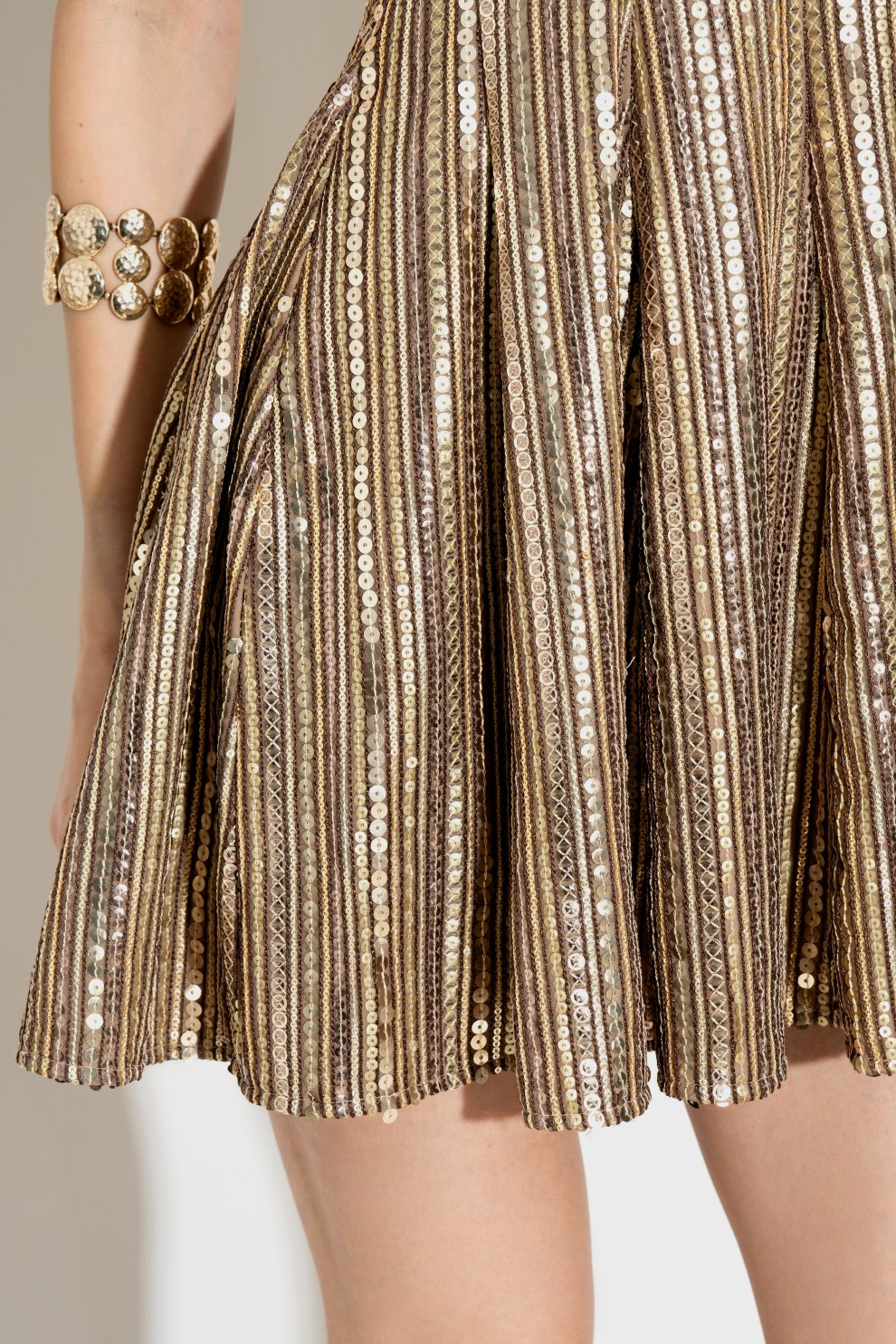 Shine at every event with this gold sequined tube dress, designed in a fit-and-flare silhouette for effortless movement. Crafted from shimmering georgette with vertical sequins, the structured bodice hugs your frame, while the flared skirt adds drama and charm. A concealed side zipper ensures a seamless fit, making this dress perfect for party season.