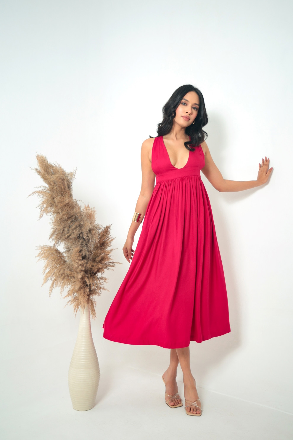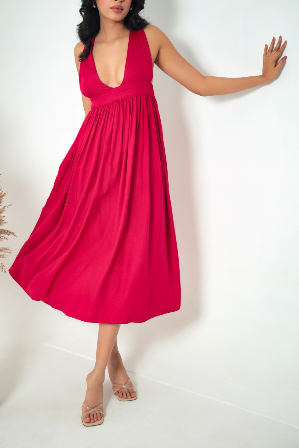 Tea & Dove Plunge Neckline Crimson Fit & Flare Dress