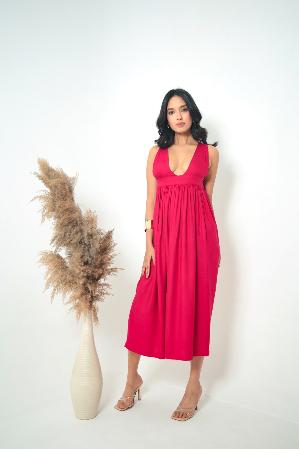 Plunge neck and defined waist offers structure without stiffness, the gathers coming from the waist adds to the architectural lines of the silhouette. The fabric holds its form while allowing freedom of movement.