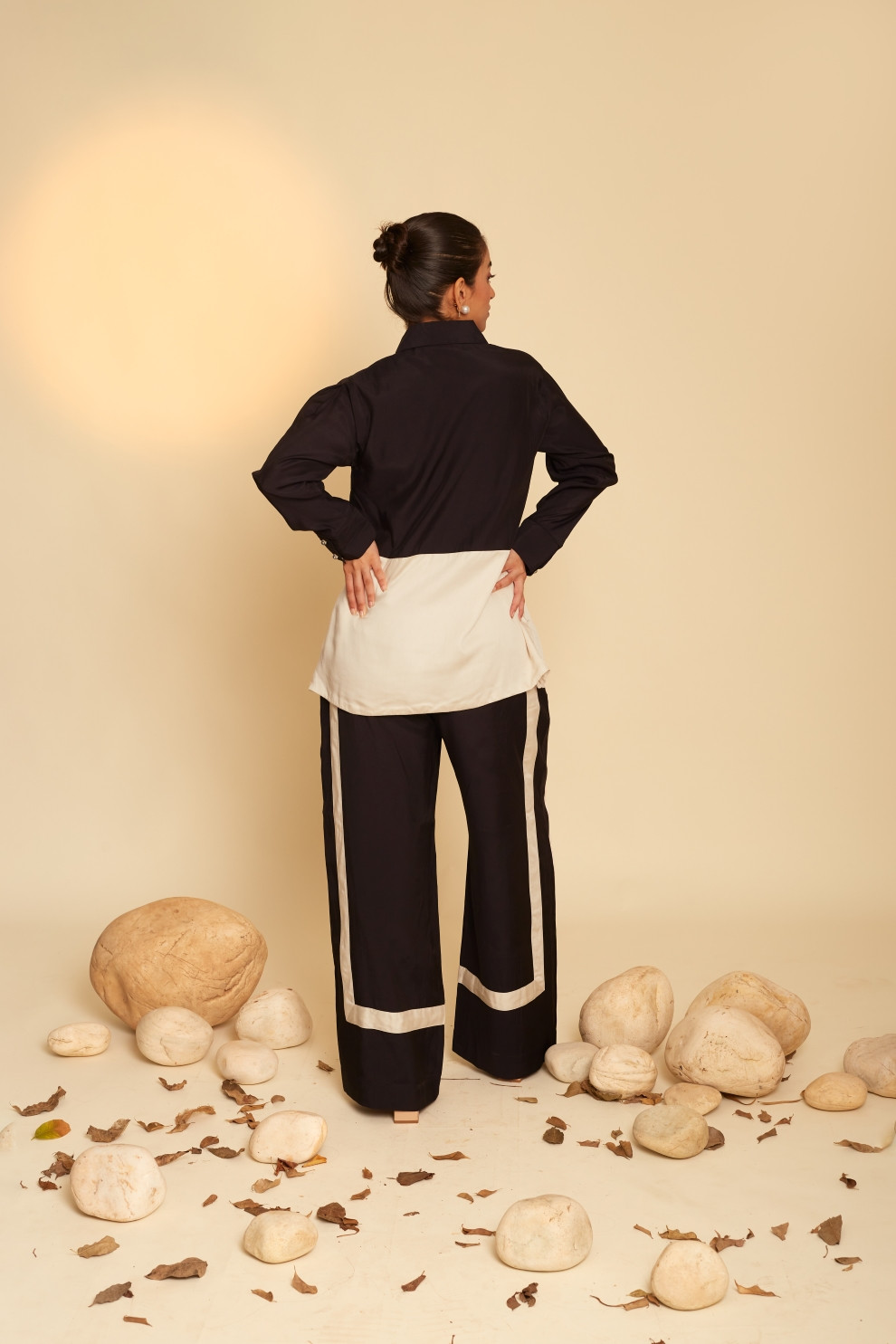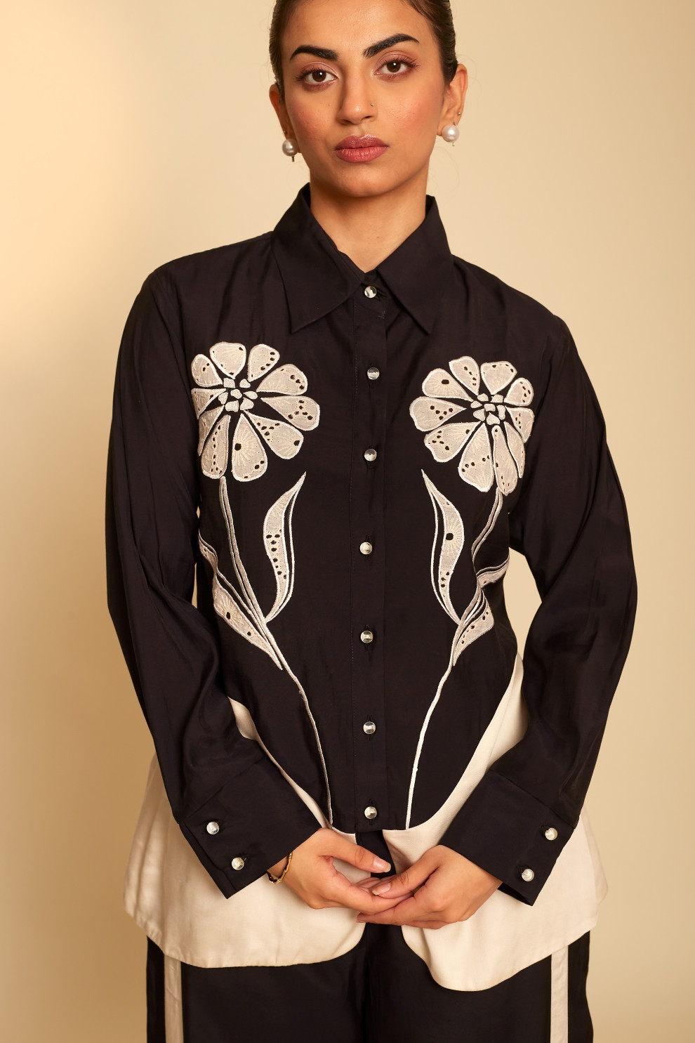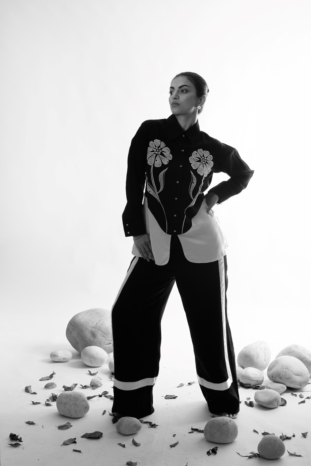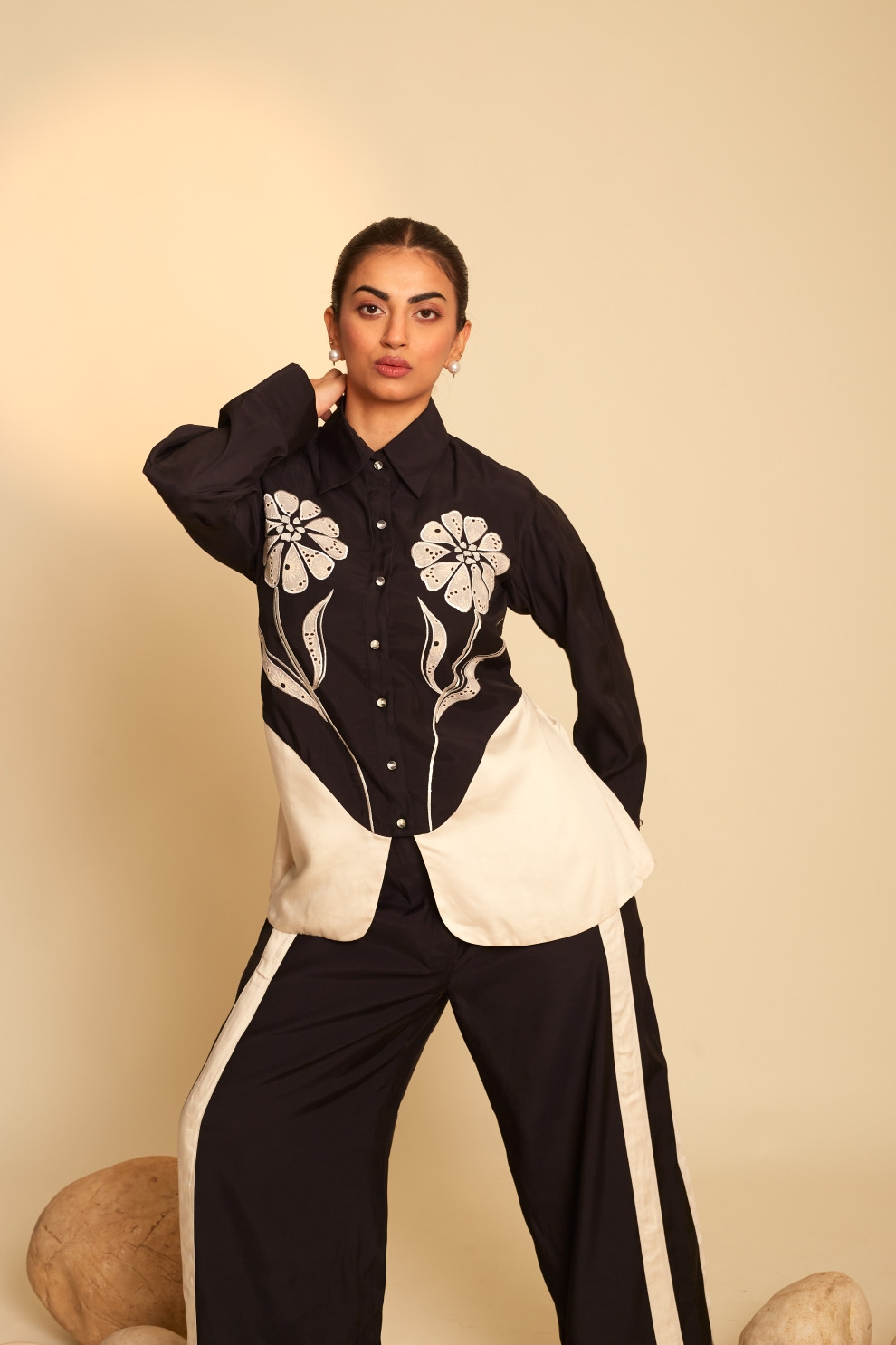 The Floris set is a dynamic ensemble, featuring striking floral patchwork embroidery on the front that serves as its focal point. Paired with striped detail pants, it effortlessly combines bold design with a touch of elegance.