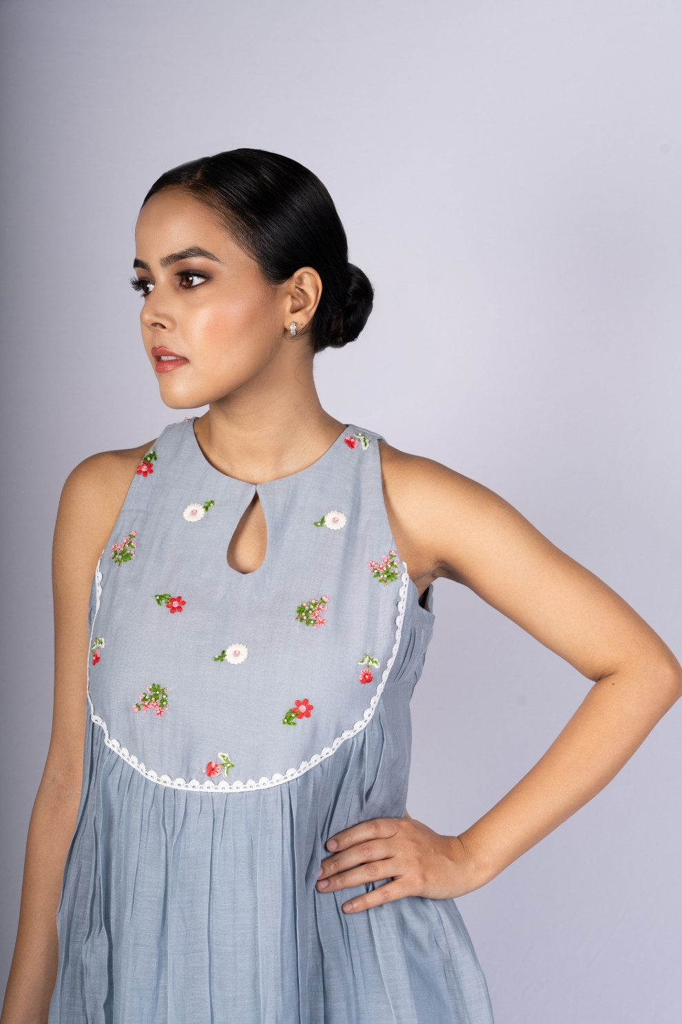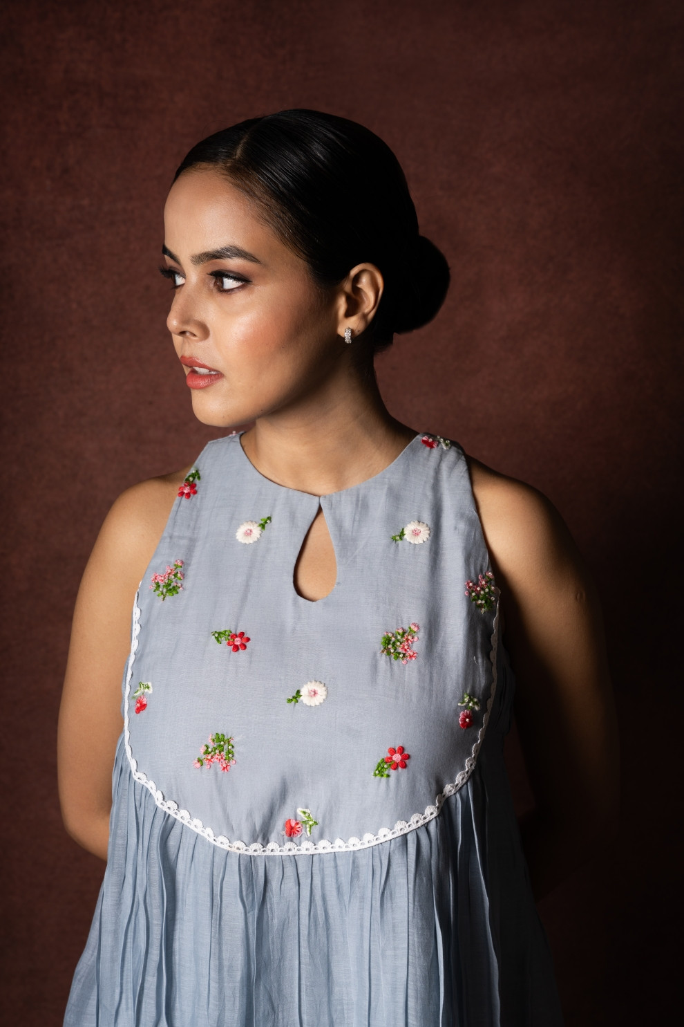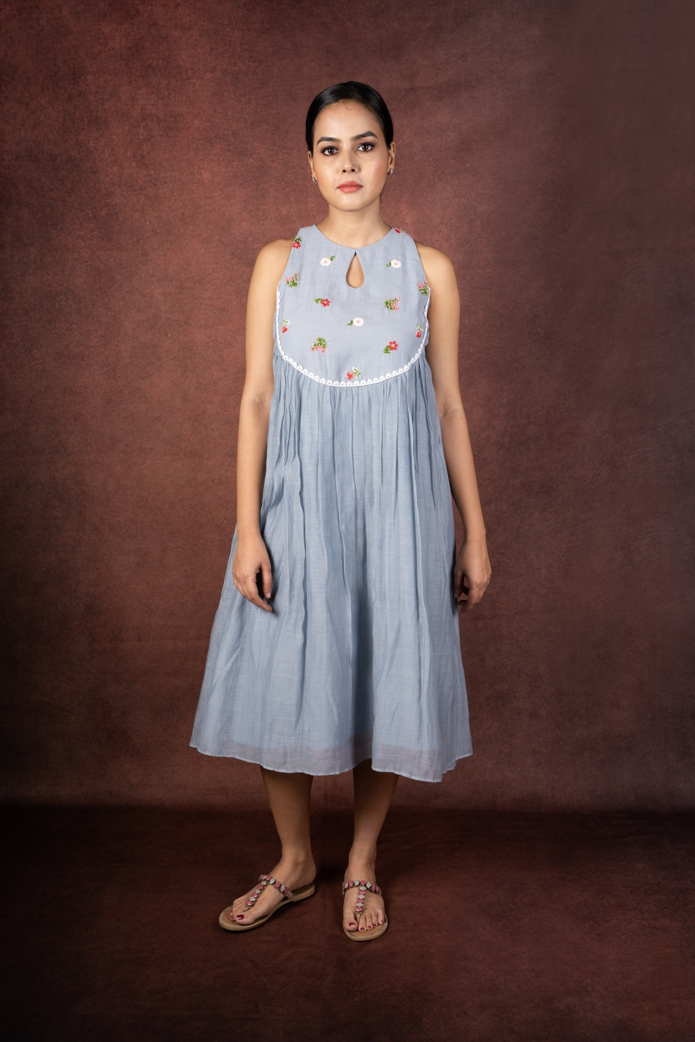 HILIHIF Megh Mul chanderi Embroidered Maxi Dress is soft and fluid in nature. The yoke embroidery keeps the aesthetic cute while the keyhole cut-out elevates the neckline. The gathers are framed together to fall in a non-bulking manner, making the stride dreamy. The soft powder blue hue makes the silhouette youthful & charming.