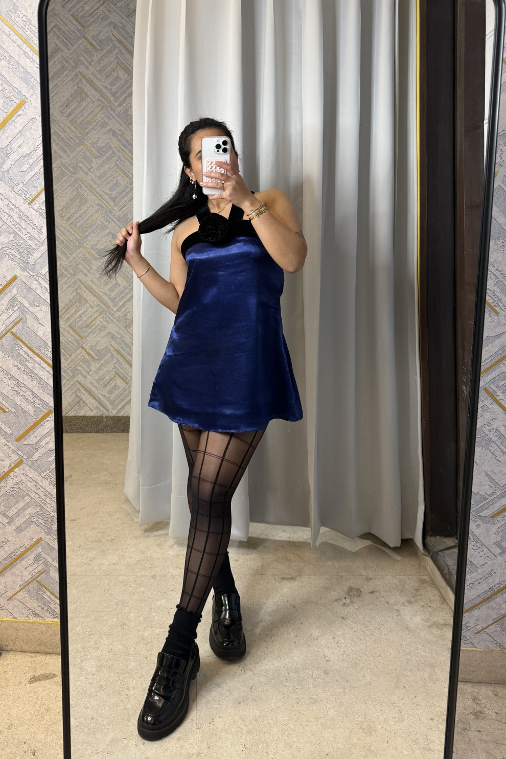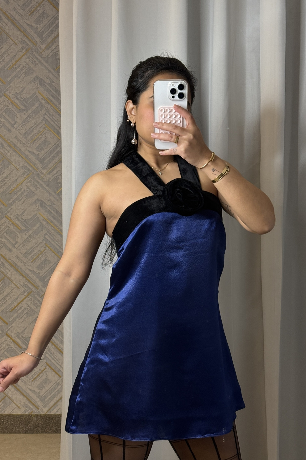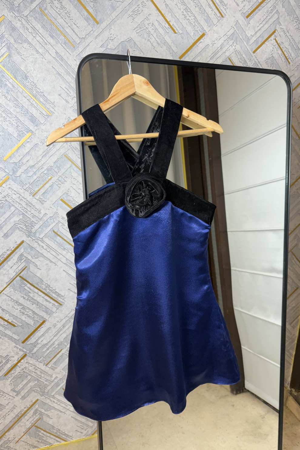Slip into elegance with the Midnight Bloom Dress, crafted in luxurious navy-blue satin and adorned with velvet straps and a handmade velvet flower at the center