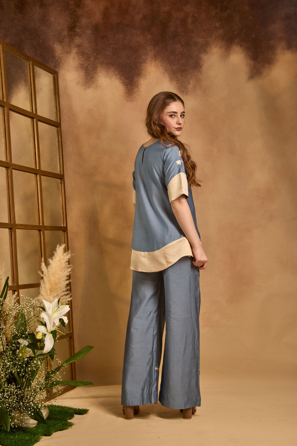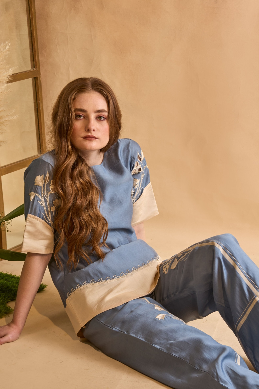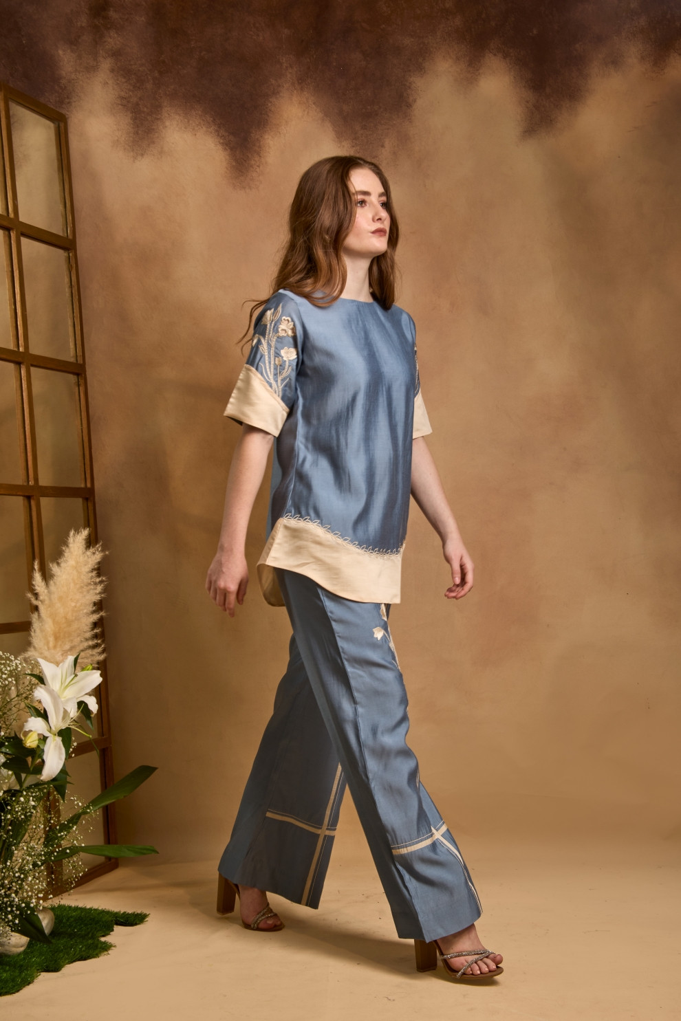 A color-blocked top featuring machine-embroidered sleeves with cutwork and threadwork patch detailing, paired with fit-and-flare trousers accentuated by embroidered panels and fine stitch-line detailing.