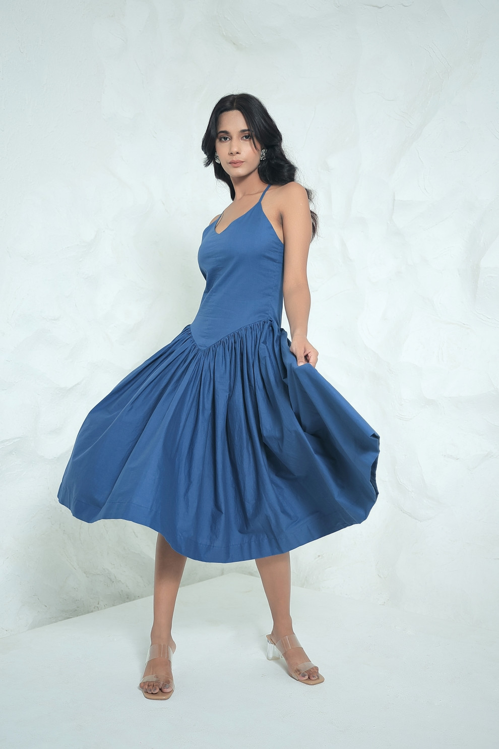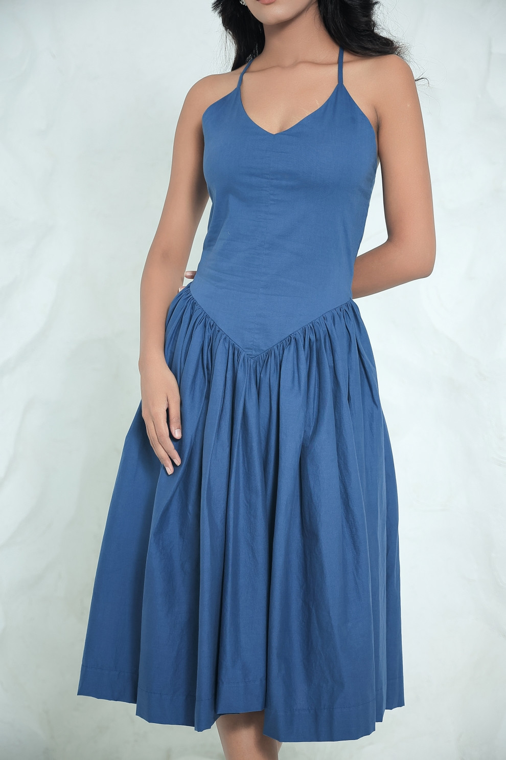 Tea & Dove Ocean Drift corset-inspired dress gives a nod to the vintage silhouette. The flattering v-dipped style plays with the retro basque waist, contouring the waist while at the same time adding volume to the flare. The cotton lycra blend enhances softness and adds adaptability to the fabric. The blue tone makes the dress feel bold but refined. It's a piece that carries nostalgia in its structure.