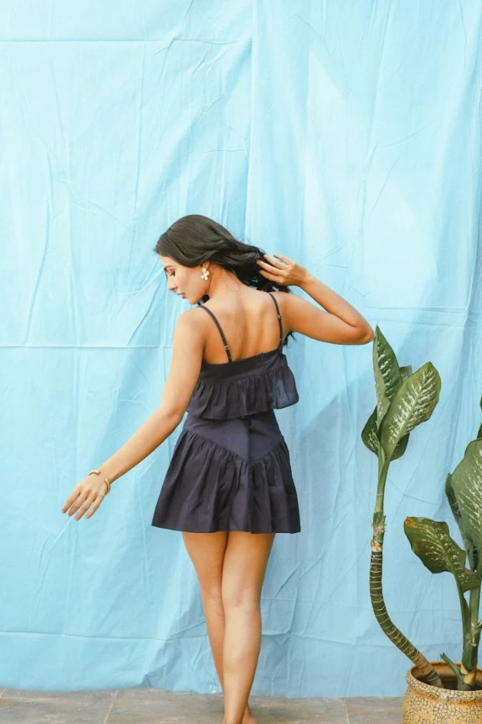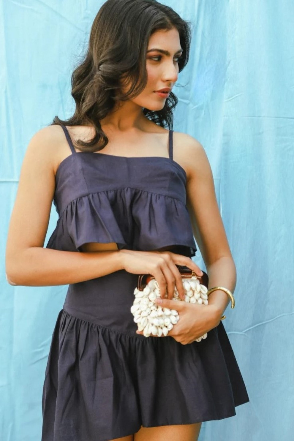 The REVE Marine Co-ord Set is a two-piece cotton co-ord set featuring a strappy empire top and a matching skirt in midnight blue with assymetic gathers. Crafted in breathable woven cotton, it offers ease and movement, making it well suited for brunches, casual days, and relaxed daytime gatherings.