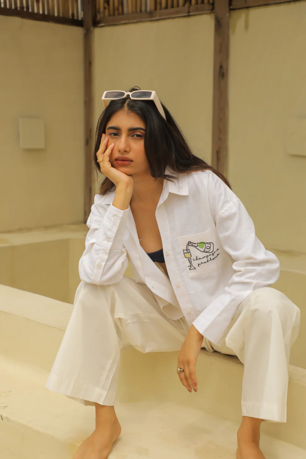 This shirt features “champagne problems” embroidered on the front pocket. The embroidery is placed with precision to maintain a clean, balanced look. Produced locally and carefully finished, the piece reflects thoughtful craftsmanship with minimal detailing across the body.