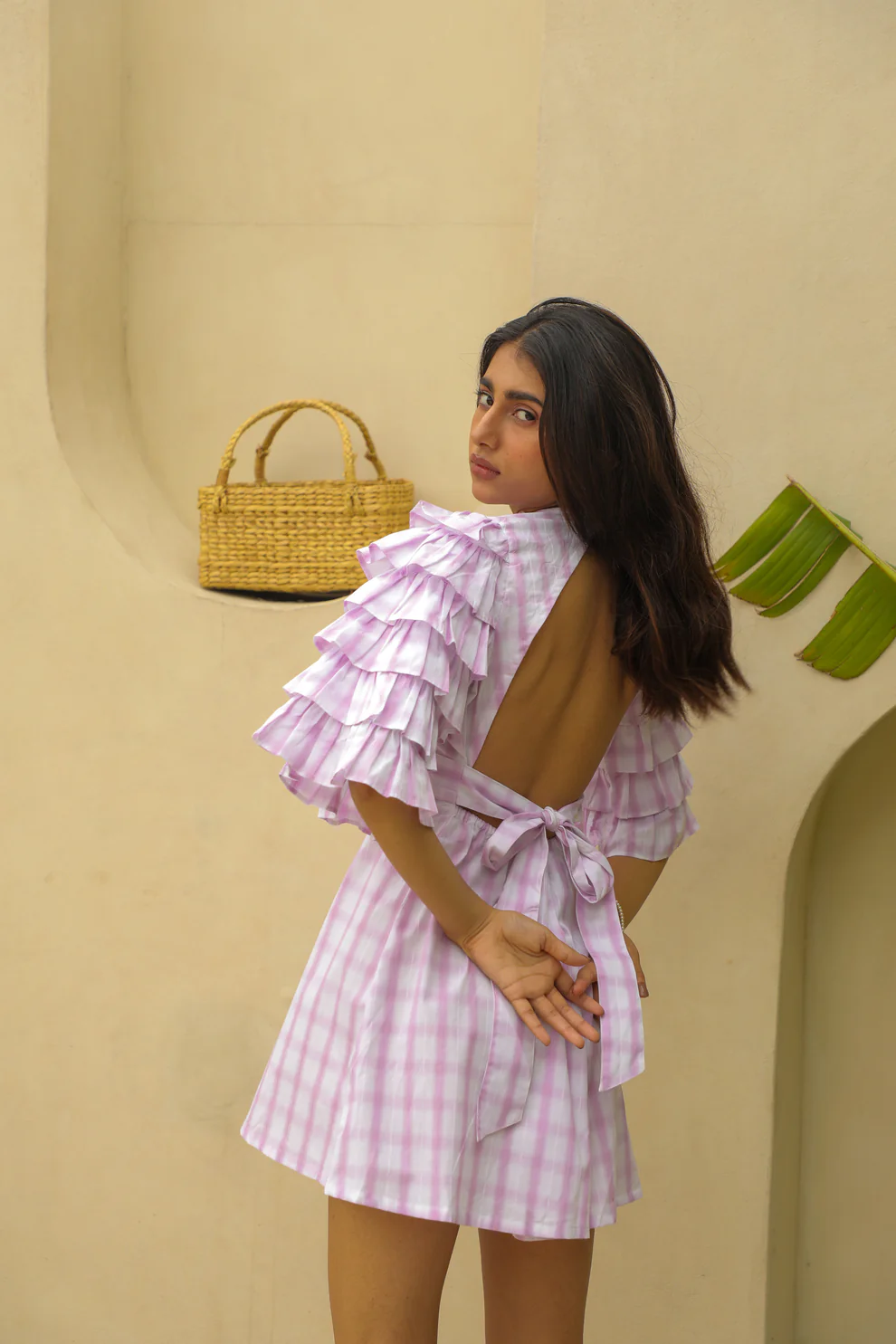 Woven from breathable cotton checks, the dress offers lightness and ease of movement. The smocked neckline provides gentle structure, layered sleeves add playful volume, and the back cut-out introduces a flirty, carefree touch while maintaining minimal detailing.