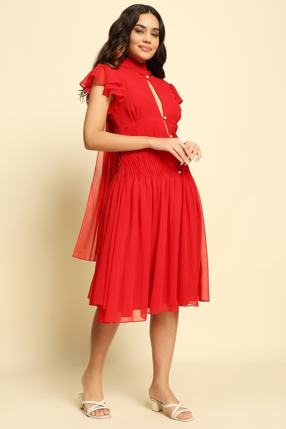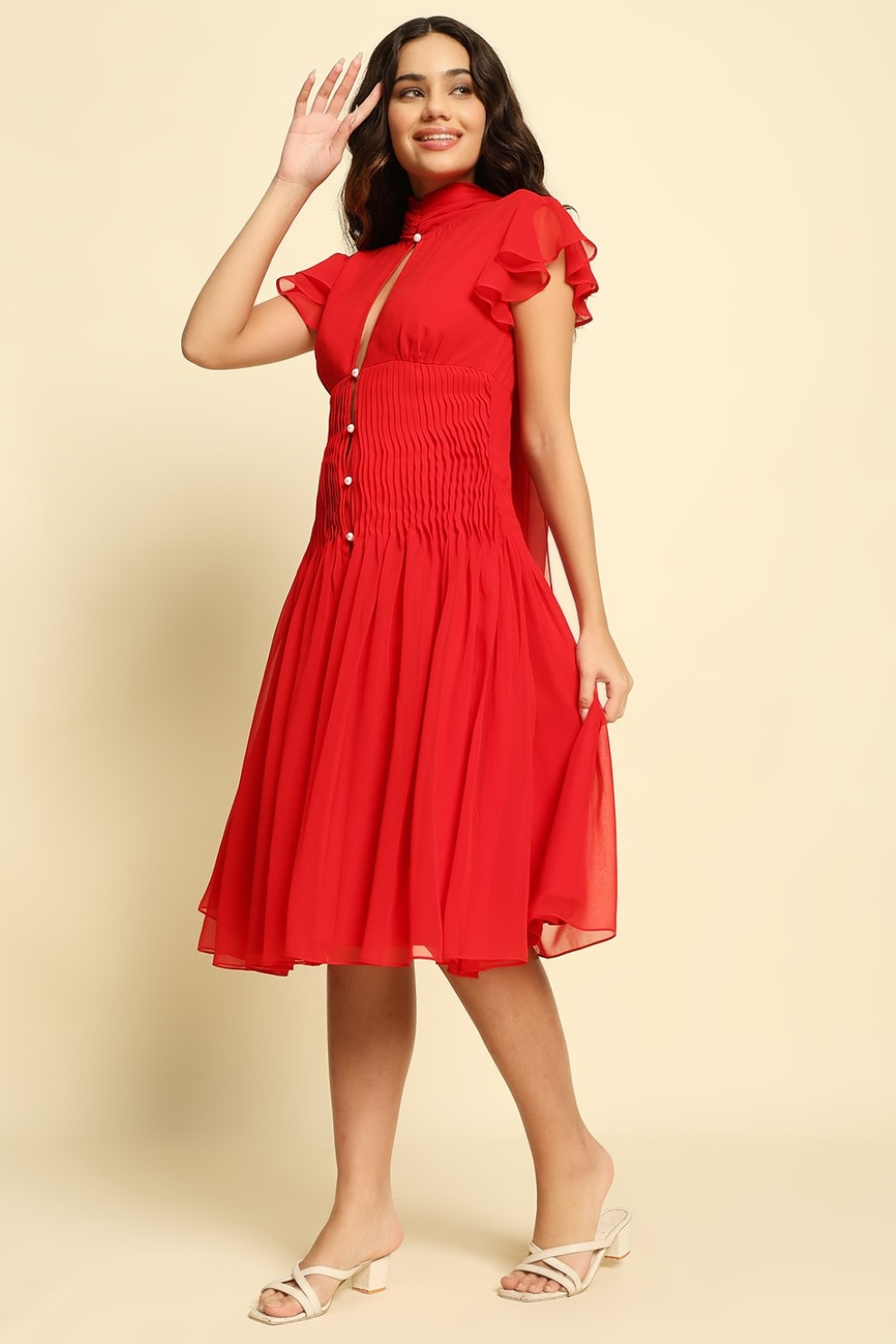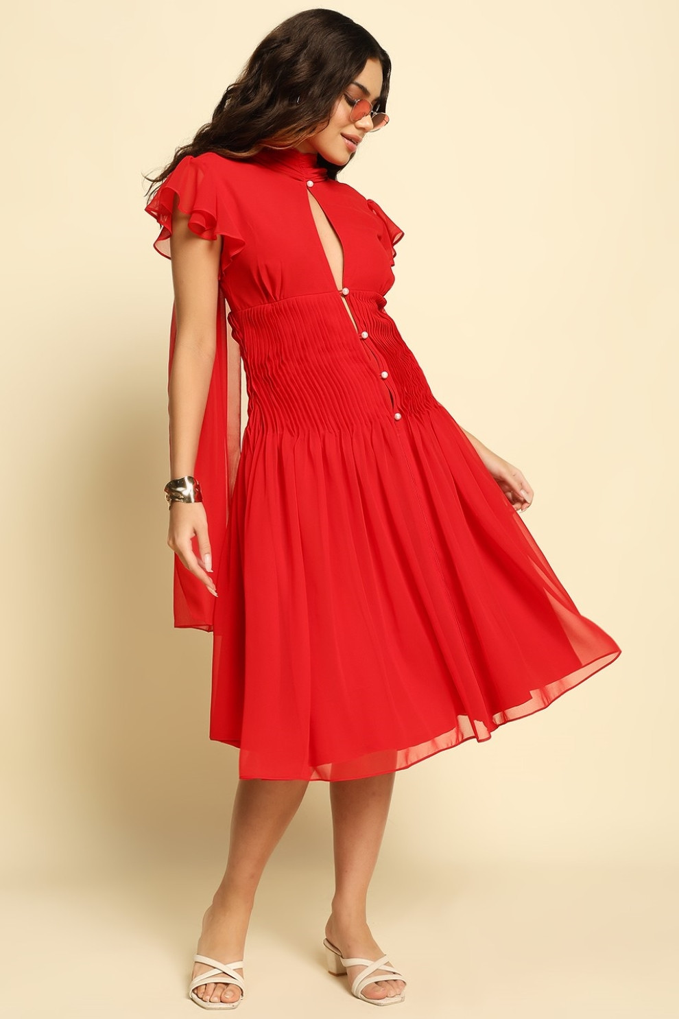 A head-turning beauty in the dreamiest red, this flowing georgette midi dress is made to move with you. Featuring a delicate leaf-shaped cut-out at the chest and a row of pearl buttons that offer subtle, peek-a-boo skin, it’s detailed with soft pintex pleating around the waist for the most flattering shape.