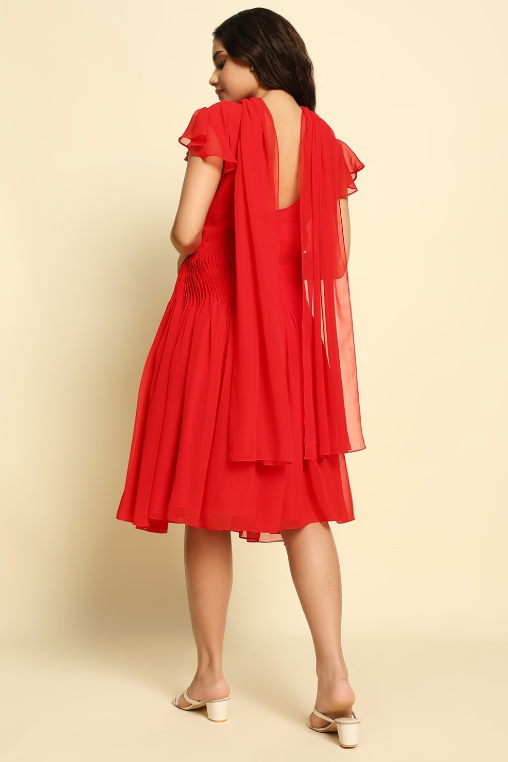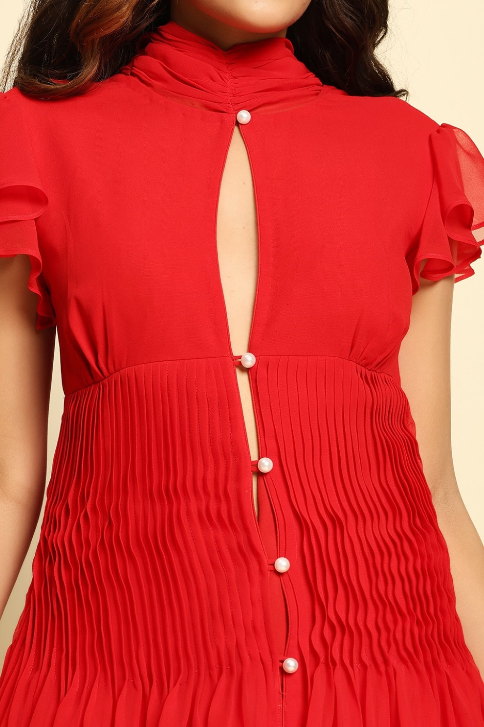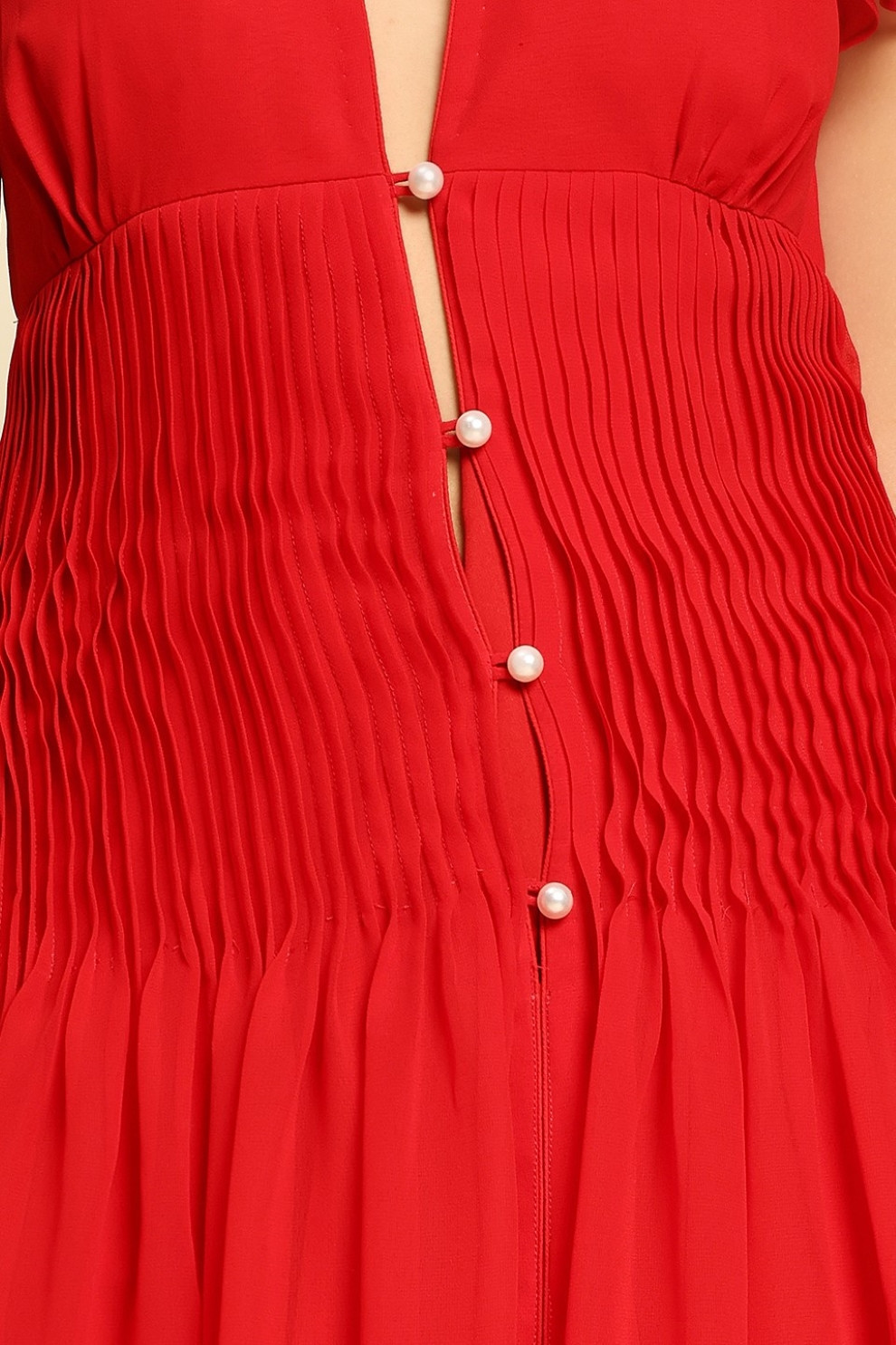 A head-turning beauty in the dreamiest red, this flowing georgette midi dress is made to move with you. Featuring a delicate leaf-shaped cut-out at the chest and a row of pearl buttons that offer subtle, peek-a-boo skin, it’s detailed with soft pintex pleating around the waist for the most flattering shape.