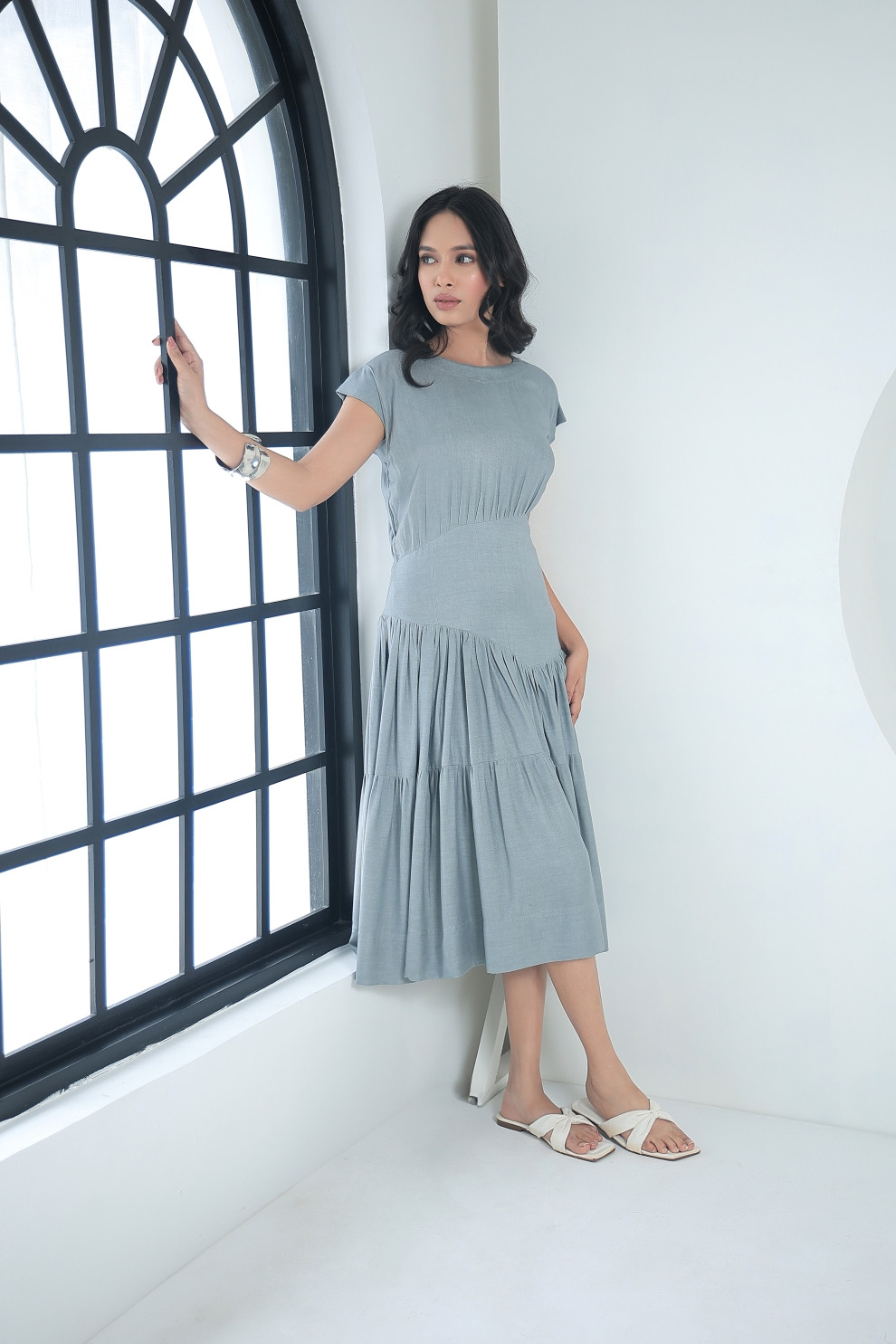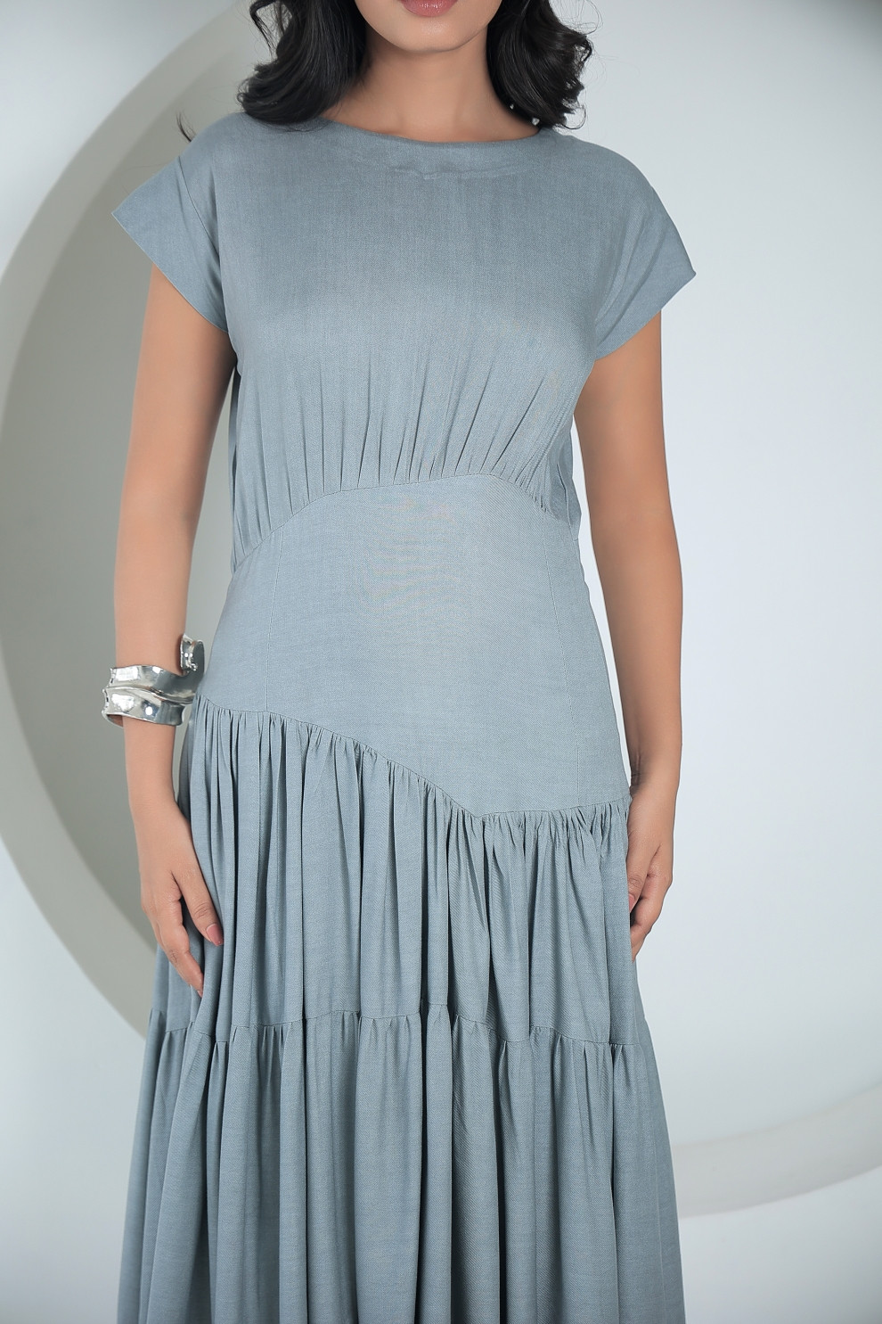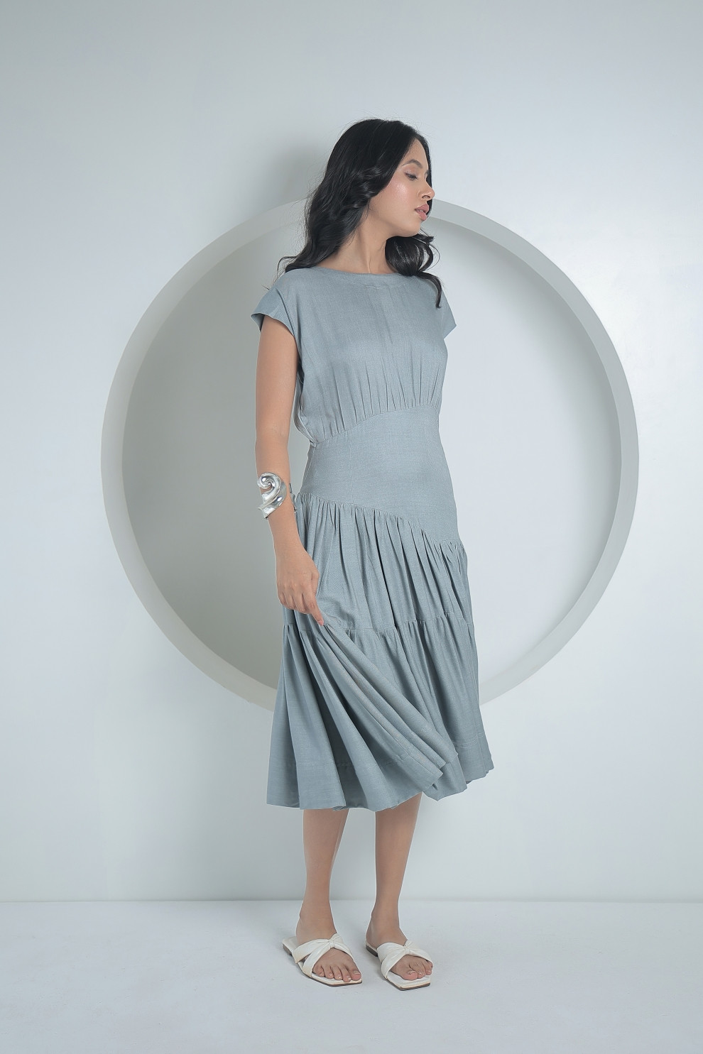 Tea & Dove Grey Asymmetric Serene Tiered Midi Dress