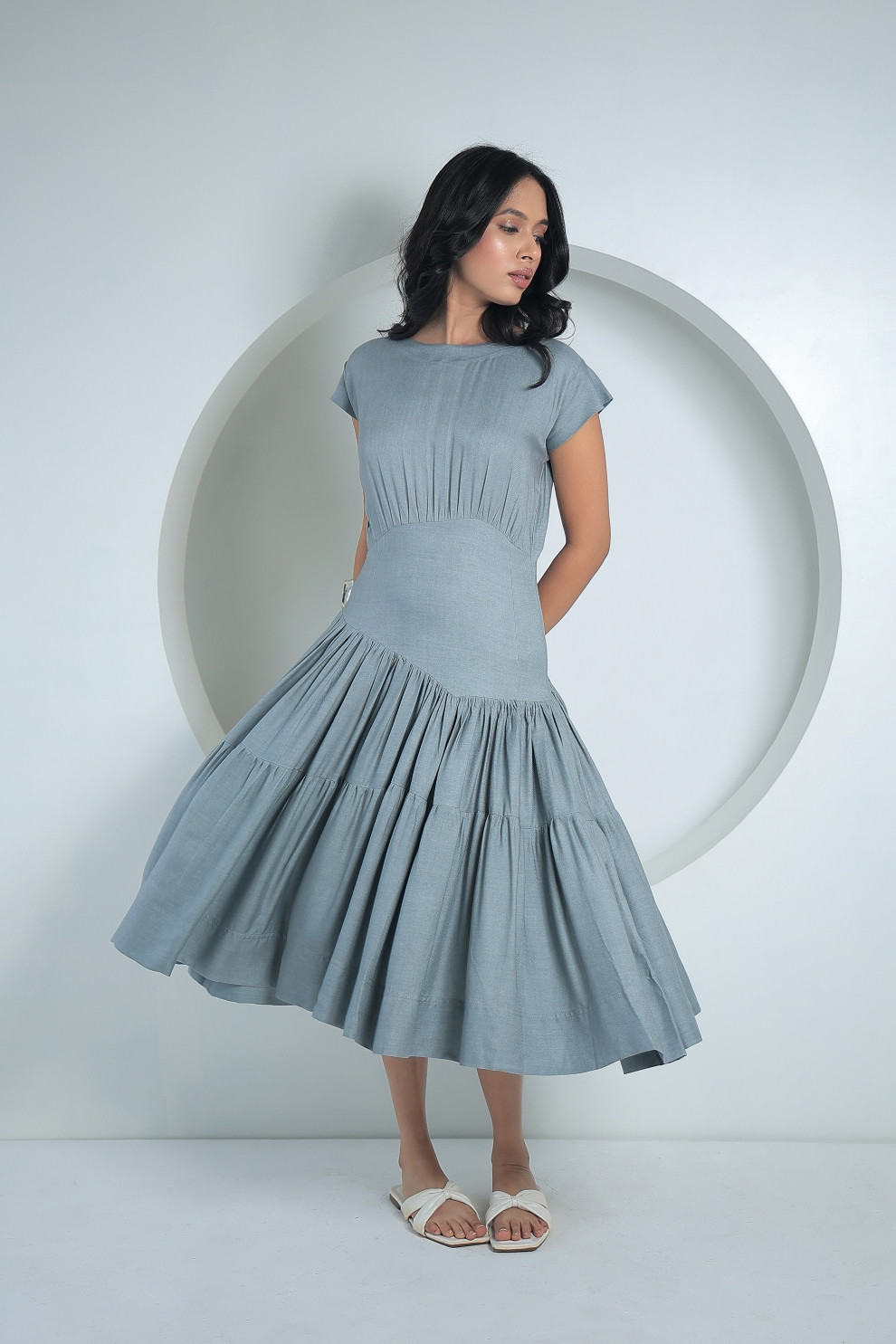 Understated yet striking, Tea & Dove grey tiered midi dress is all about quiet confidence. The asymmetric drip is unconventional and modern in nature, while the tiered gathers add dramatic volume to the silhouette. The twill fabric provides optimal durability while keeping the style intact.