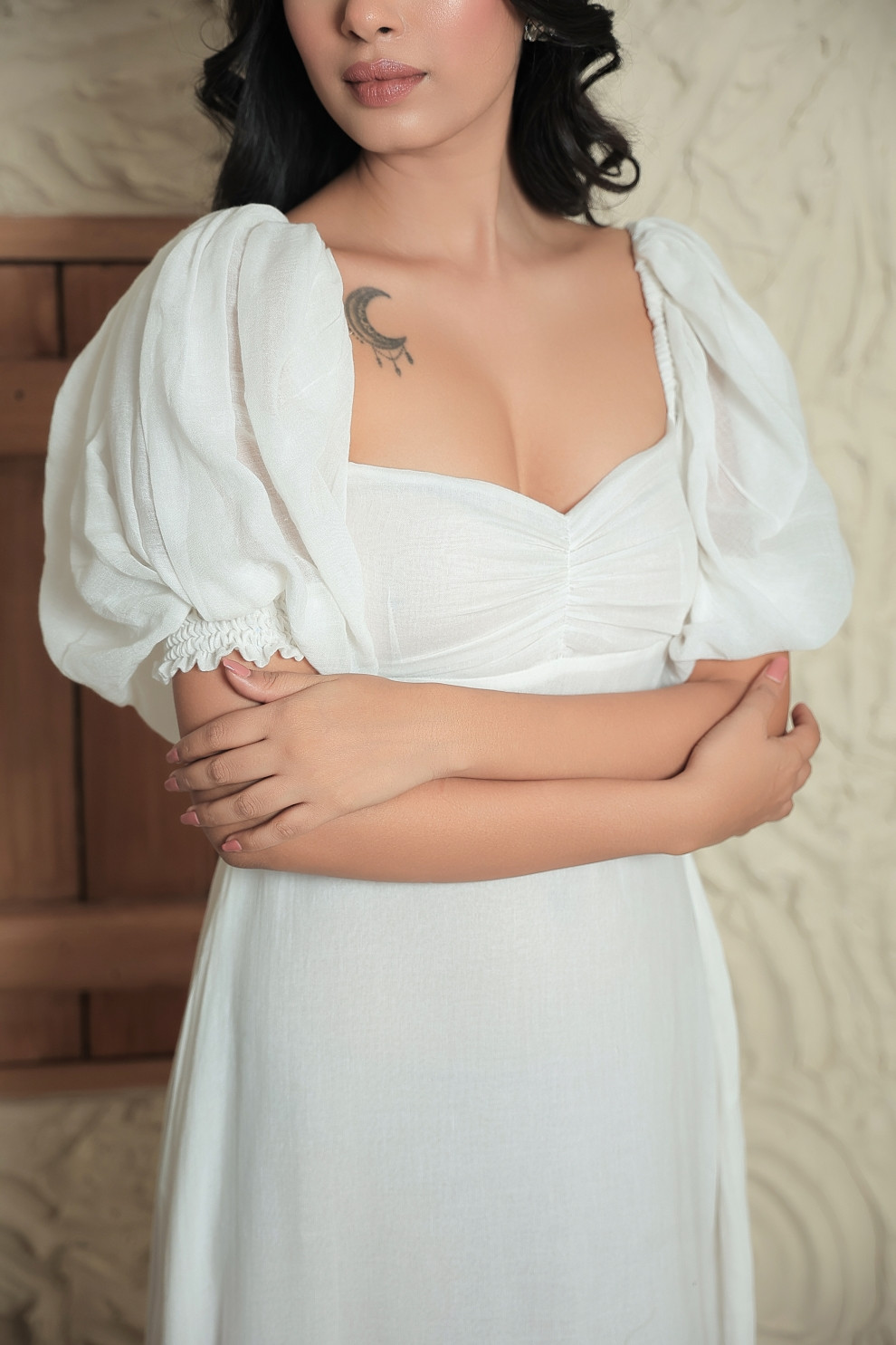 Pair with minimalist sandals to complement its graceful length. Keep jewellery subtle — fine chains, pearl accents enhance its heavenly vibe without overpowering it.