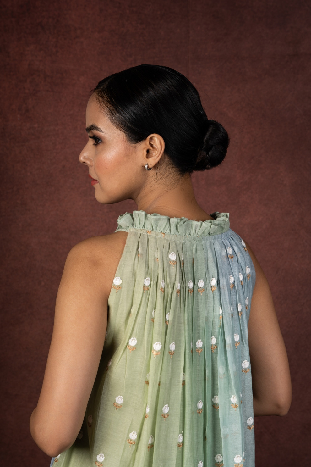 The mul chanderi fabric offers breathability and fluidity, while fine gathers and delicate floral embroidery highlight refined artisanal craftsmanship. The sleeveless cut adds to the modern styling.