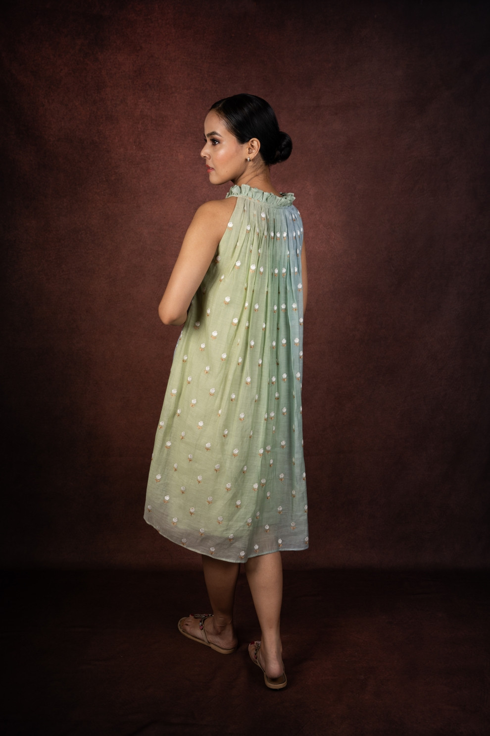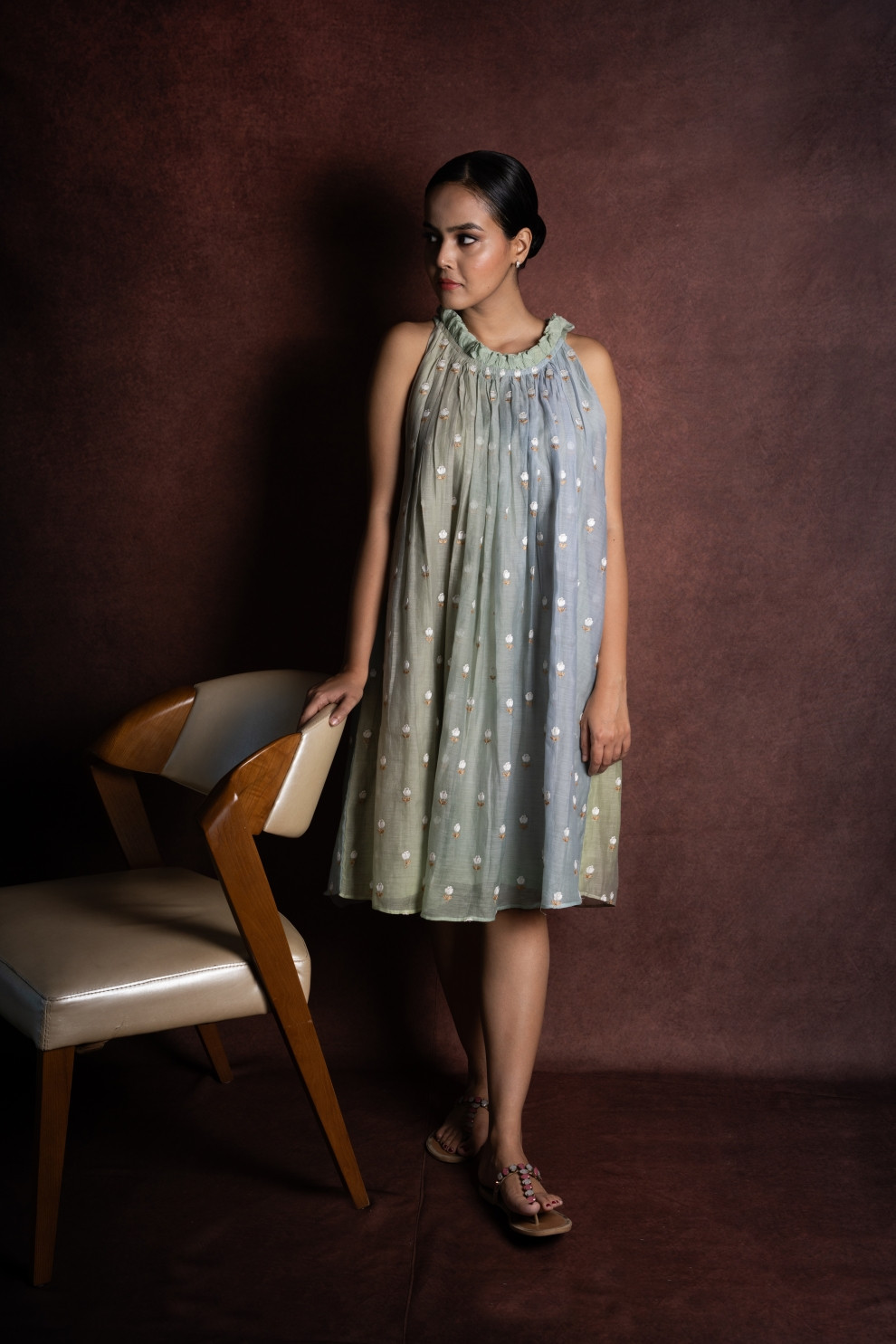HILIHIF Tarang Mul Chanderi Silk Dress is designed to make you feel graceful and quietly radiant. The fluid and flared silhouette gives it a dreamy appeal. Crafted in airy mul chanderi silk, the fabric feels gracefully sheer and lightweight. A delicate ruffled neckline adds a romantic, feminine touch, while embroidered floral motifs scattered across the surface enhance its handcrafted charm.