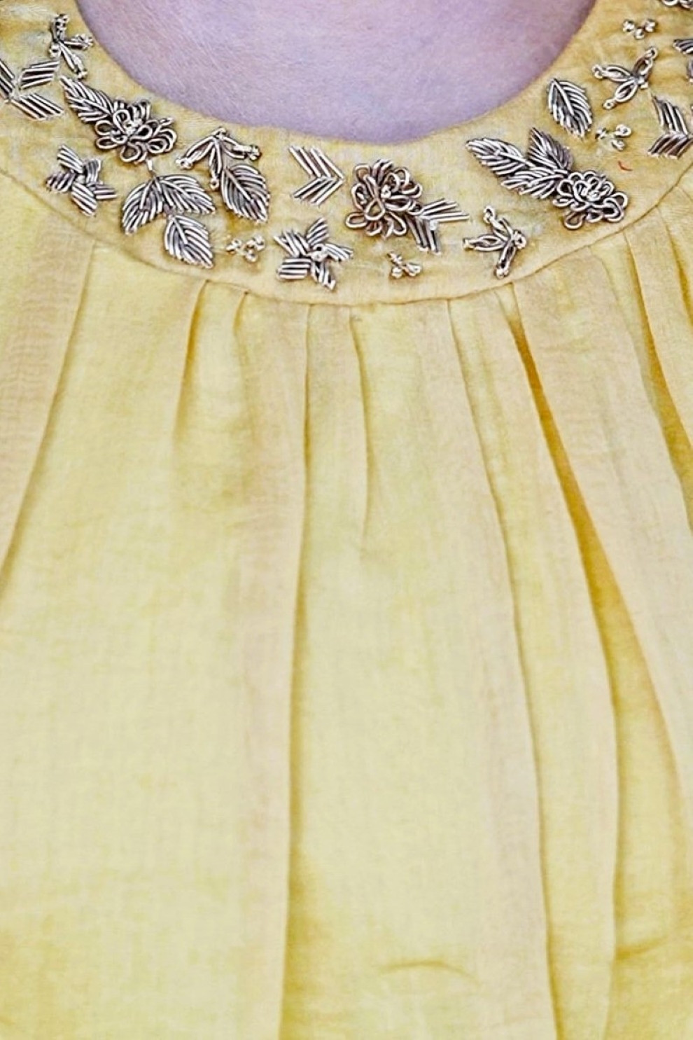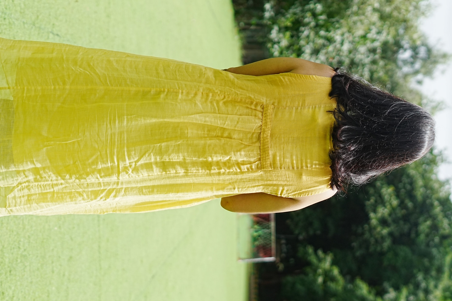 The mul chanderi fabric provides understated sheen with airy silhouette. The hand embellishment at the neck applauds the craftsmanship.