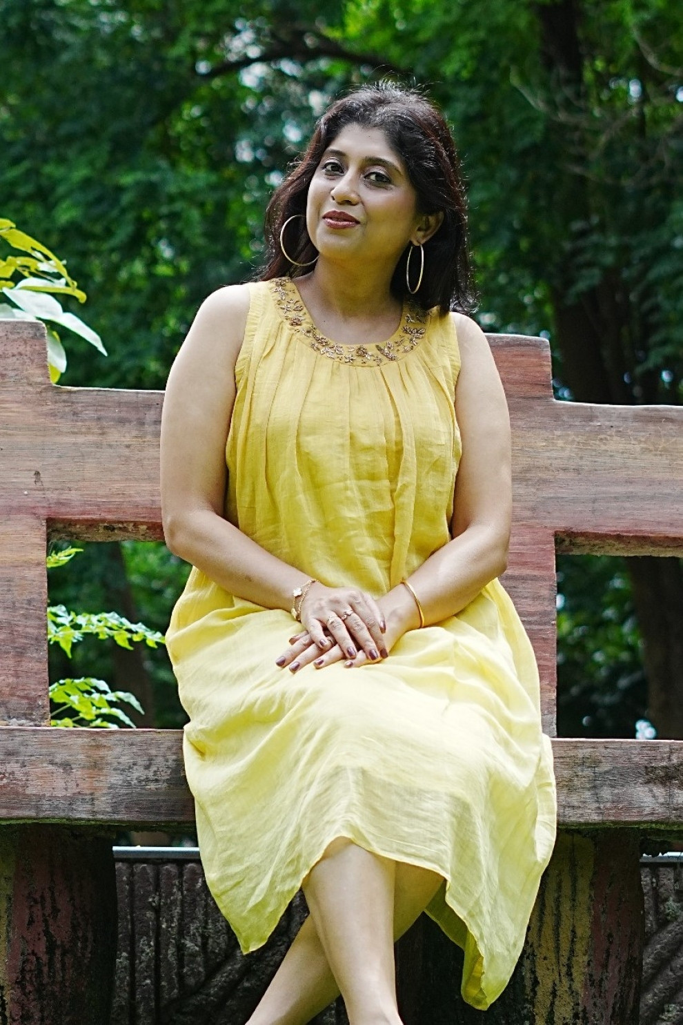 HILIHIF Tattva Embellished Round Neck Dress in airy mul chanderi feels fluid and quietly radiant. Embellishment elevates the timeless round neck, while the sleeveless cut gives it a modern appeal. The sunkissed warm hue can brighten-up any daytime event. The overall aesthetic remains minimal with a sophisticated flair.