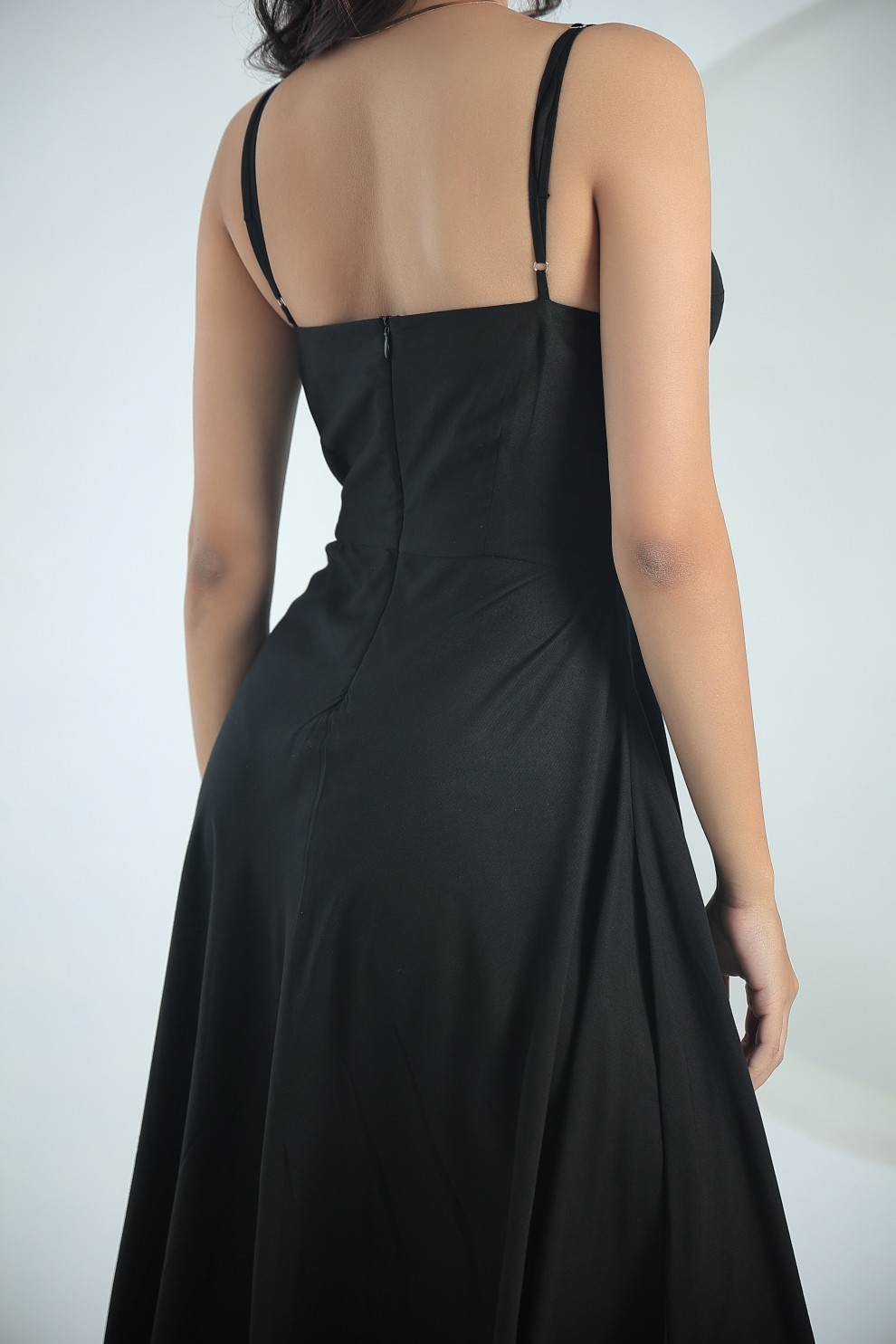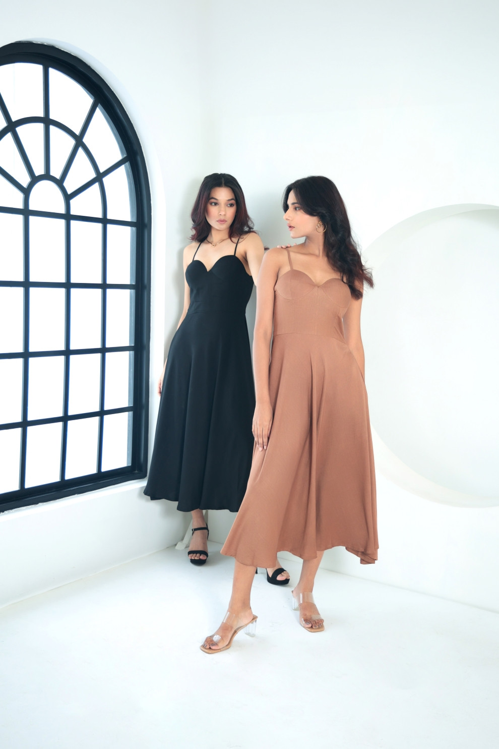 Tea & Dove black dress is designed to flatter with ease. The sweetheart neckline is timeless with a touch of romance while softly framing the décolletage. Fitted to the bodice while flaring towards the hem creates a balanced shape. The eco-friendly tencel fabric is lightweight and smooth.