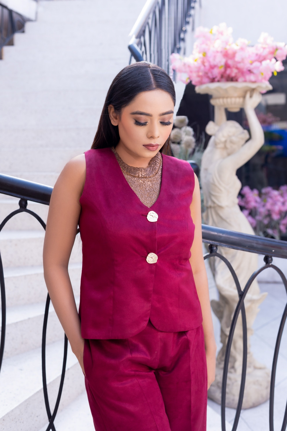 Tea & Dove winery ascend co-ord set is a modern take on the suit style. The waistcoat with tailored pants truly speaks balances the power , making it a perfect example of power dressing. The button details make it style statement, while the straight pants elongate the silhouette. The suede fabric completes the look with sheen finish.
