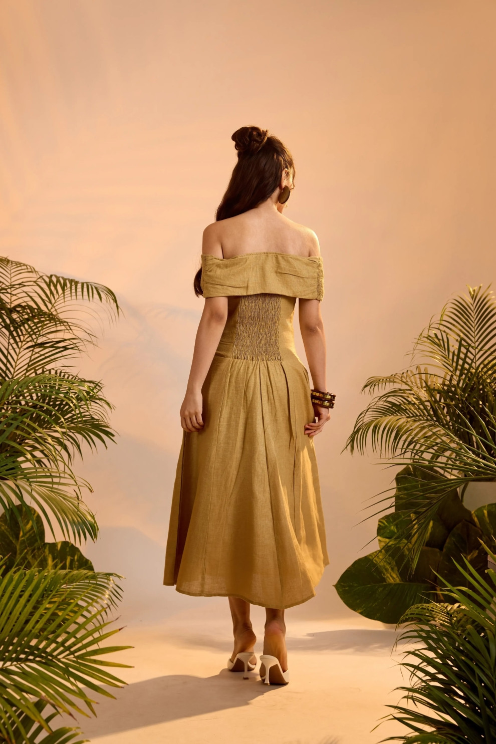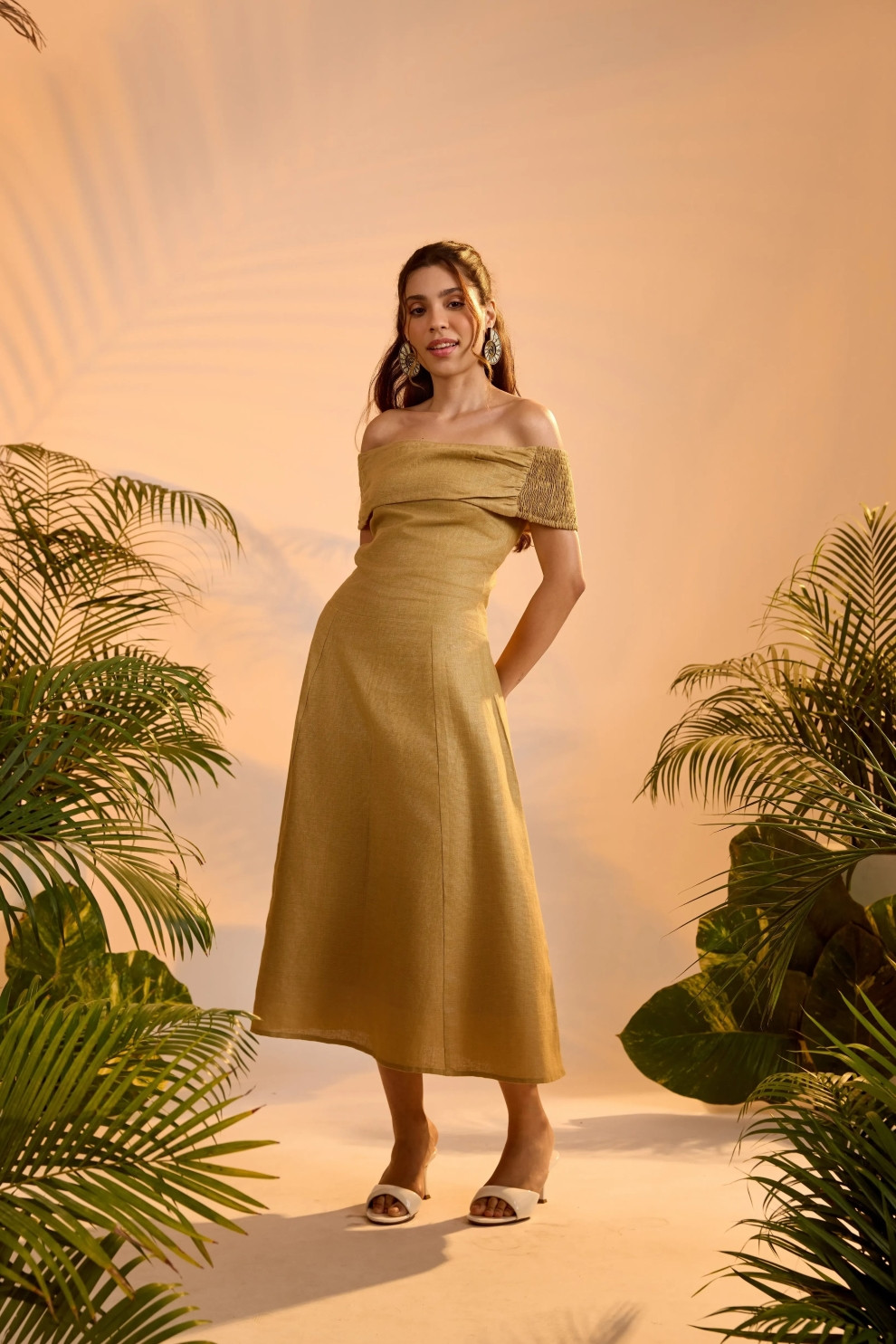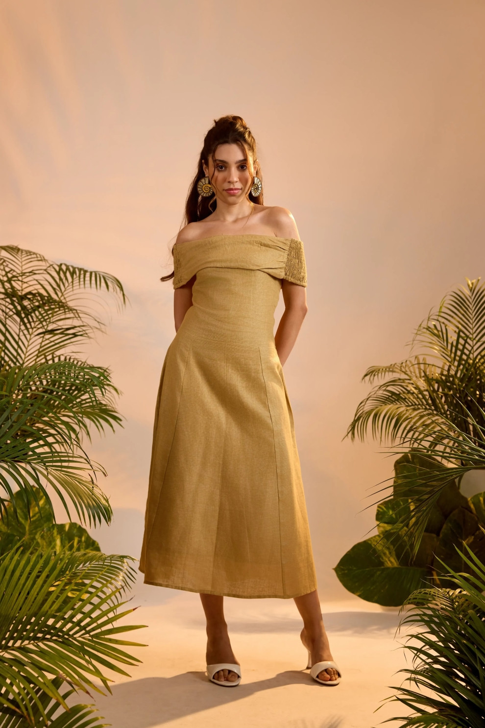 An off-shoulder stunner with a sense of movement. The Yara Dress is shaped with a gently flared midi skirt, smocked back, and ruched elastic sleeves that rest delicately on the arms. With a foldover neckline, it merges elegance with ease — perfect for garden parties or barefoot dancing under the stars.