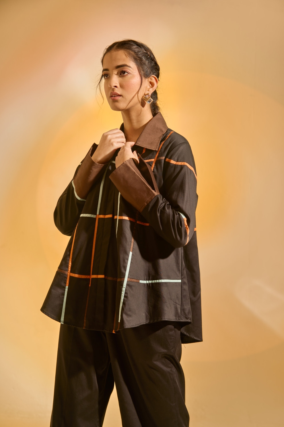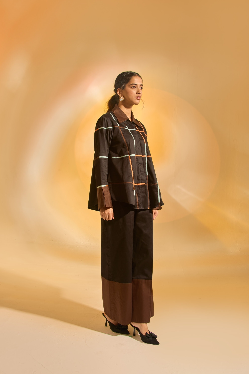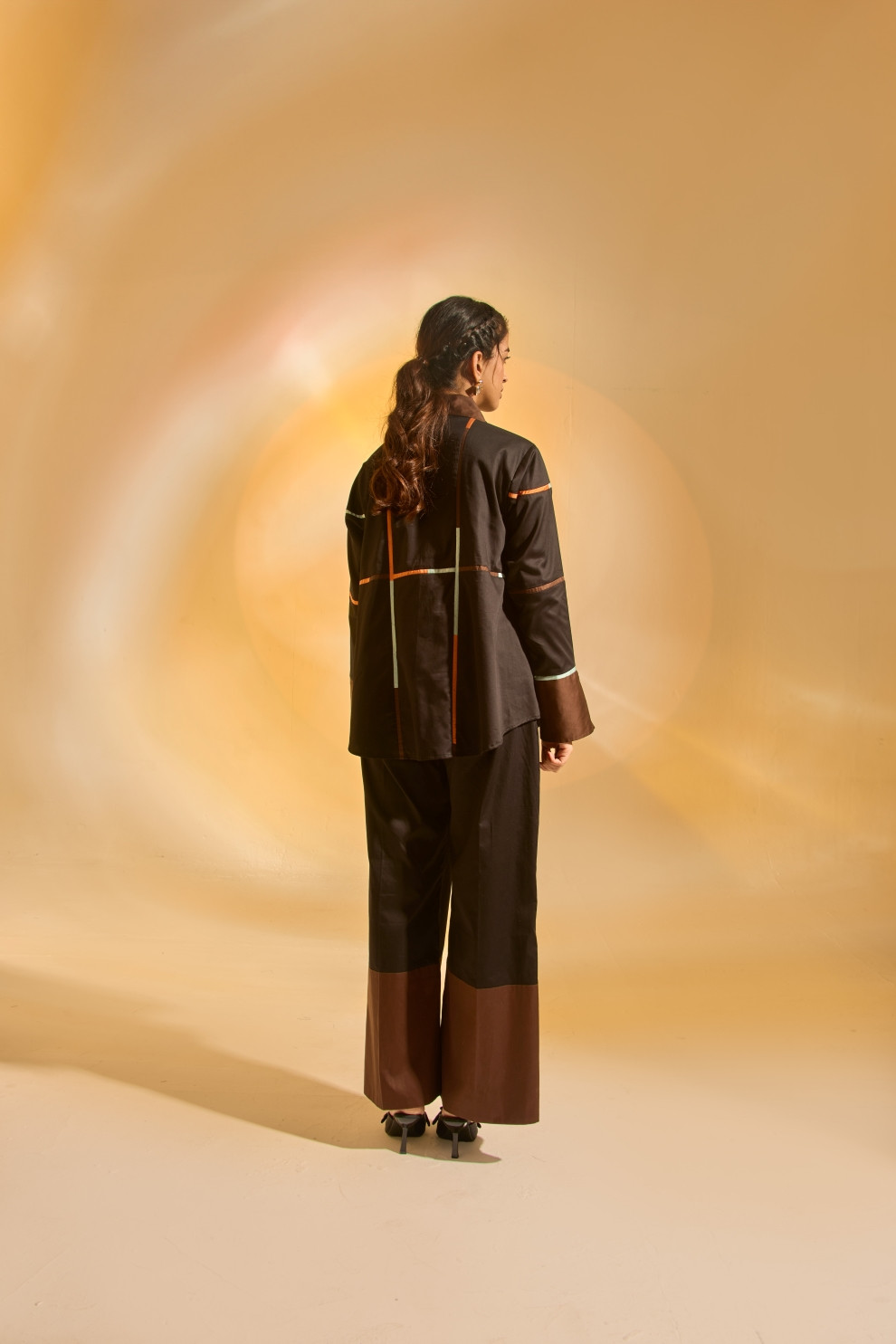Breezy yet bold, this relaxed A-line shirt is designed for effortless movement, featuring vibrant multicolor fabric inserts that add a playful touch of contrast. Paired with straight-fit pants, color-blocked at the hem for a striking structural finish