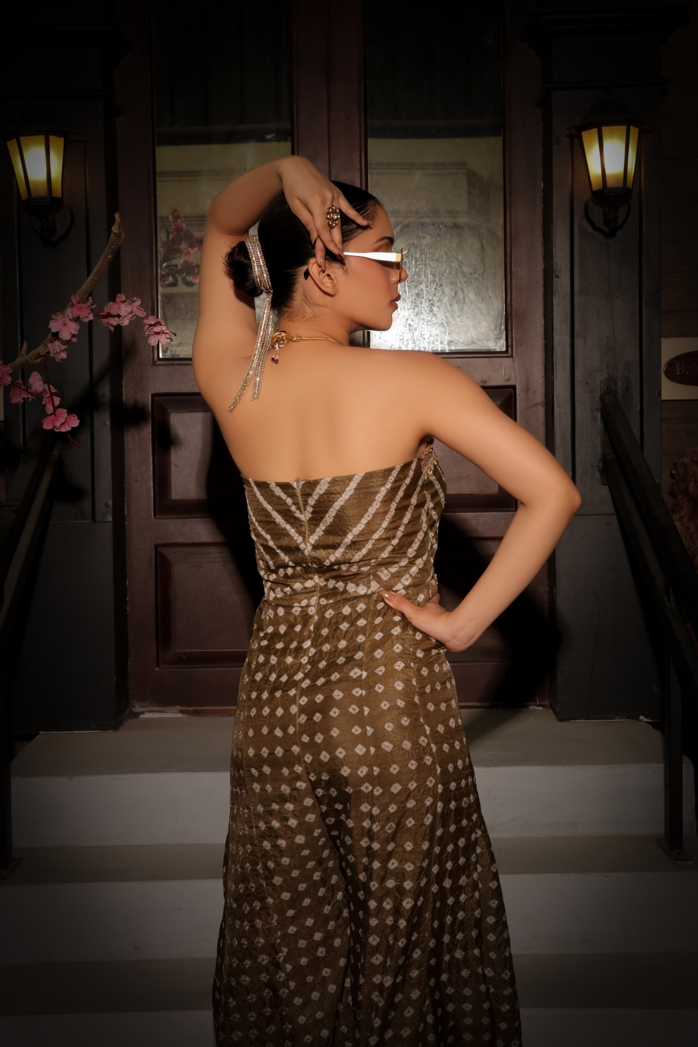 Tea & Dove Zayra Olive Gota Detailed Jumpsuit blends heritage detail with a contemporary silhouette. Designed with a fusion sense of mind, it compliments Bandhani-inspired motifs with an off-shoulder design. The gota detail at the pockets elevates the functional aspect of it, while the dramatic flare creates character. The silk fabric lends sheen finish and visual depth.